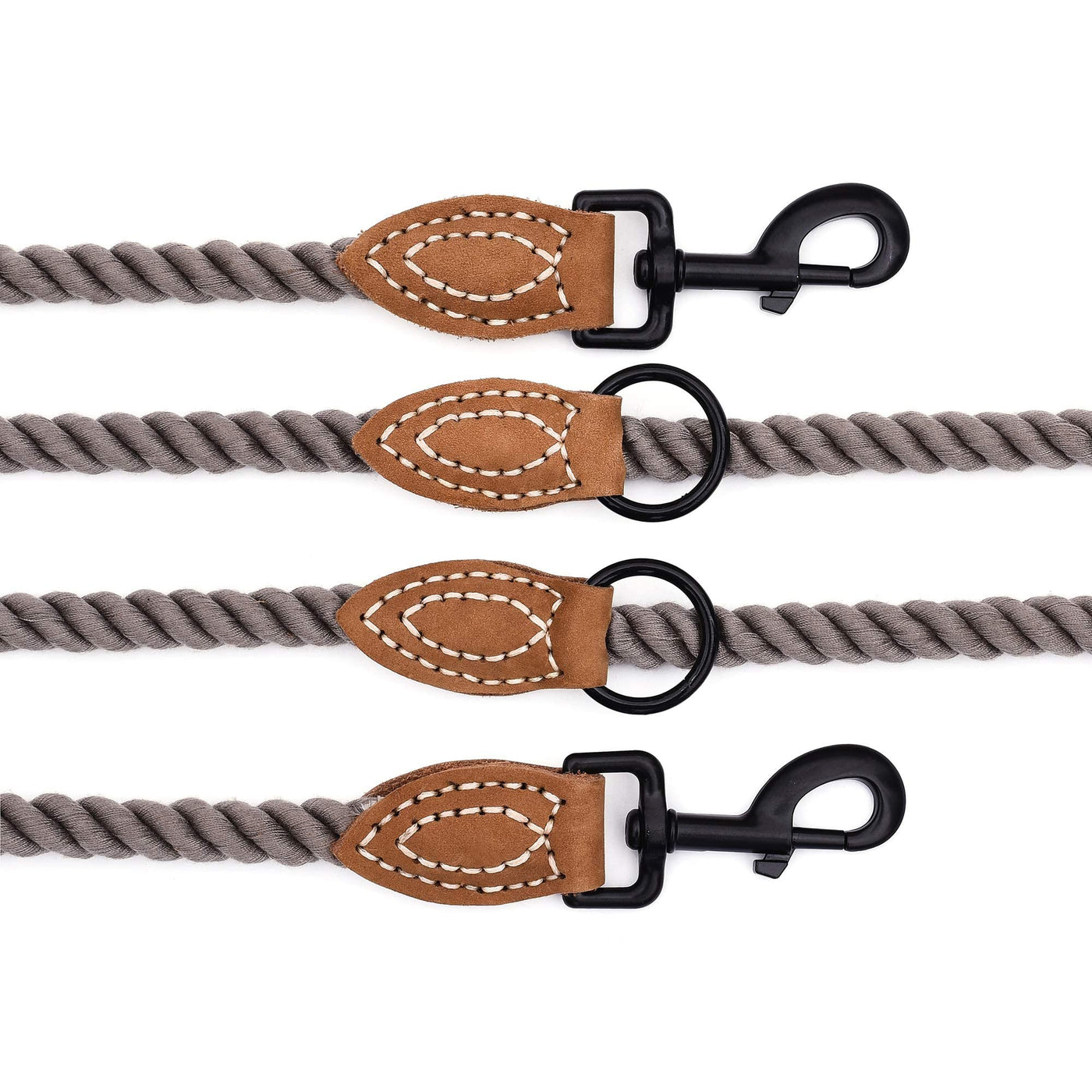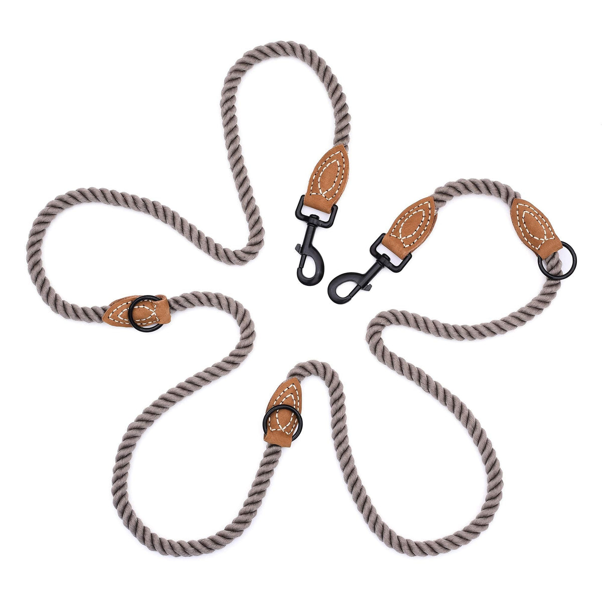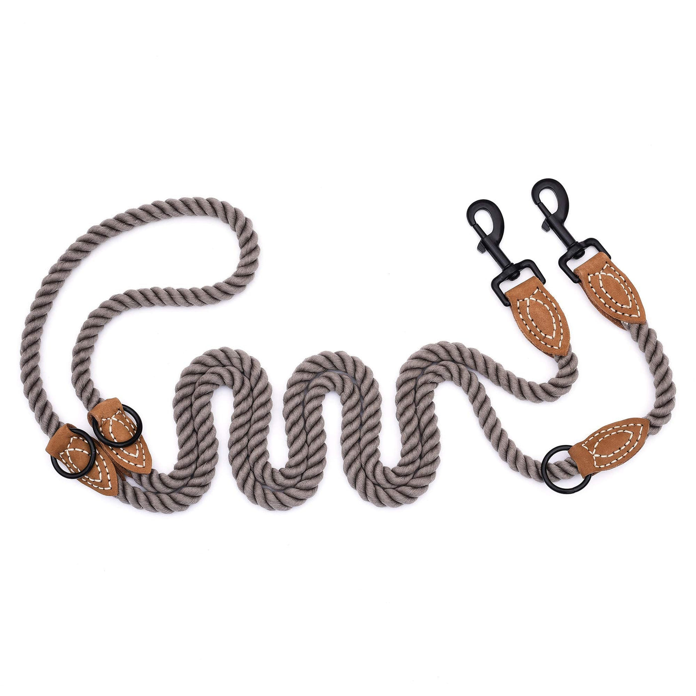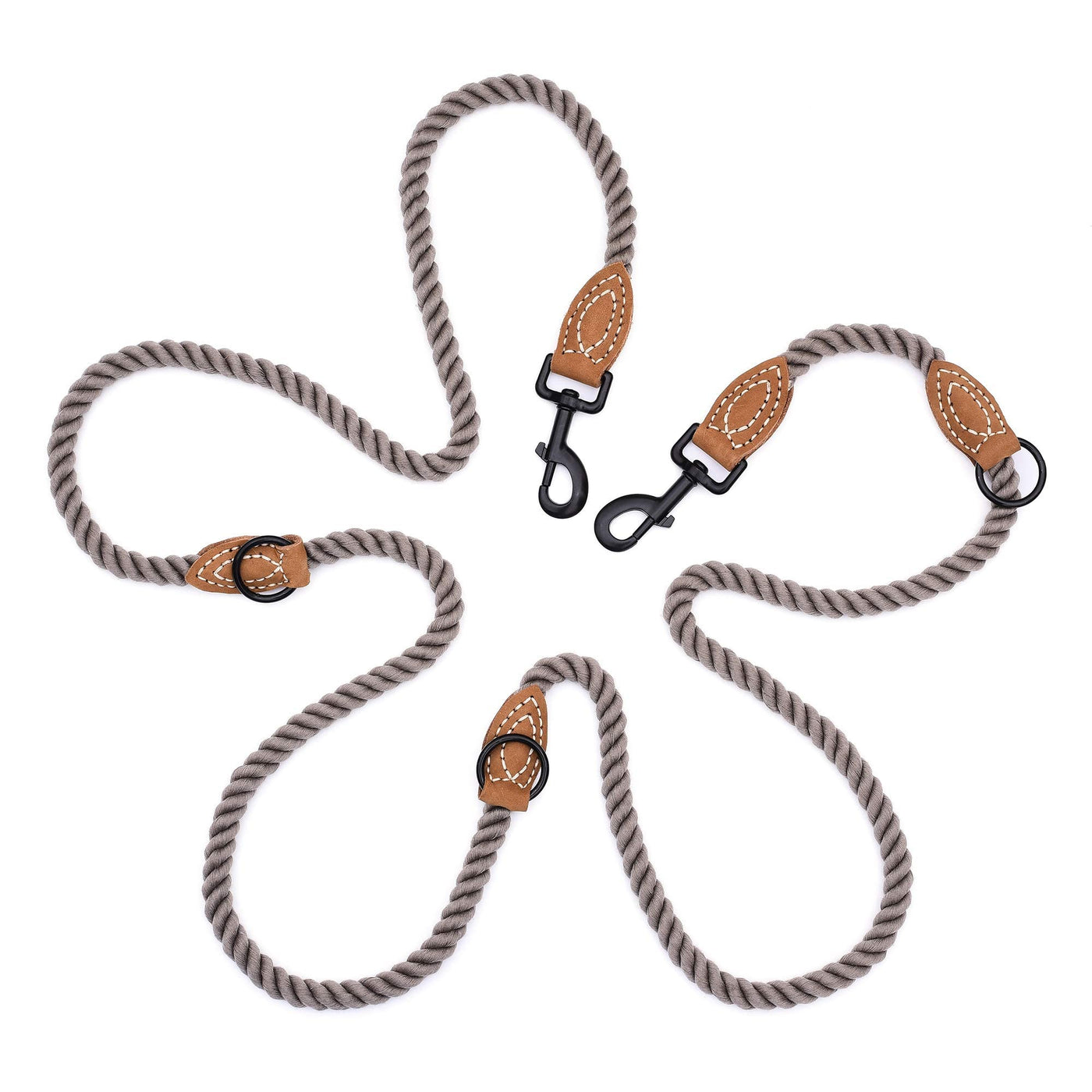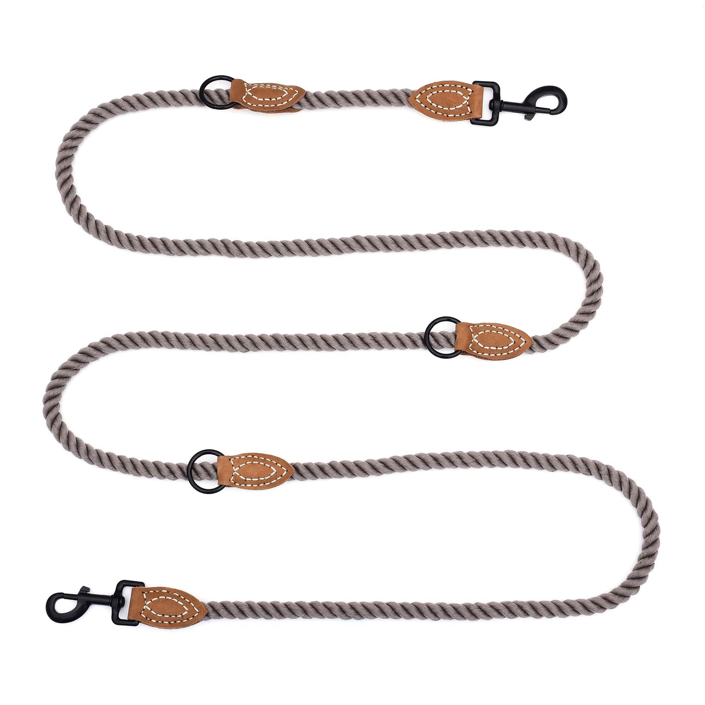 Q: What are the main features of the Mile High Life Double Dogs Rope Leash?A: The Mile High Life Double Dogs Rope Leash is made from durable mountain climbing rope and features a heavy-duty metal clasp with a classic leather connection. It offers multi-functional configurations including double dog setups and adjustable lengths (4/5/6 feet), as well as a comfortable grip due to its rope and leather design.