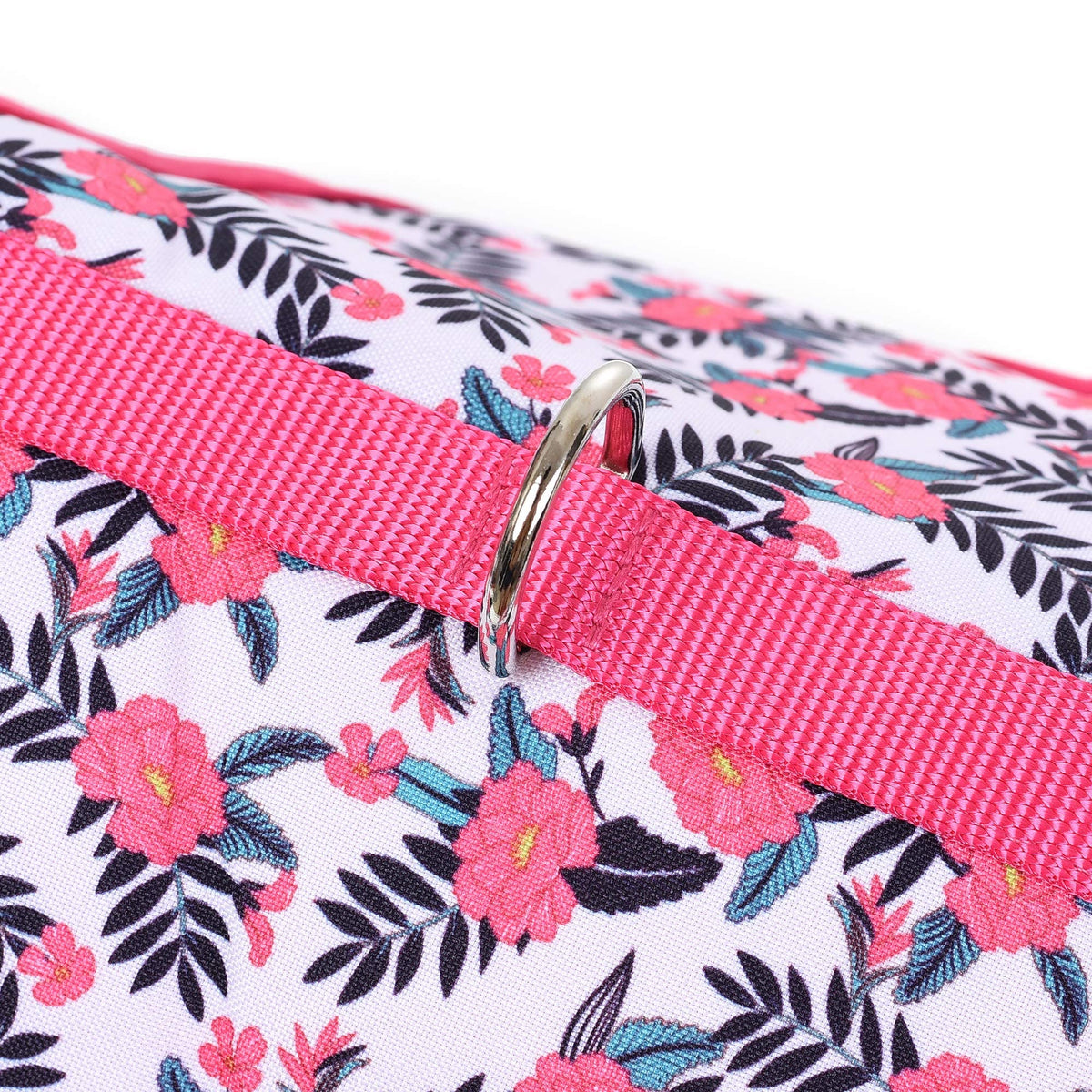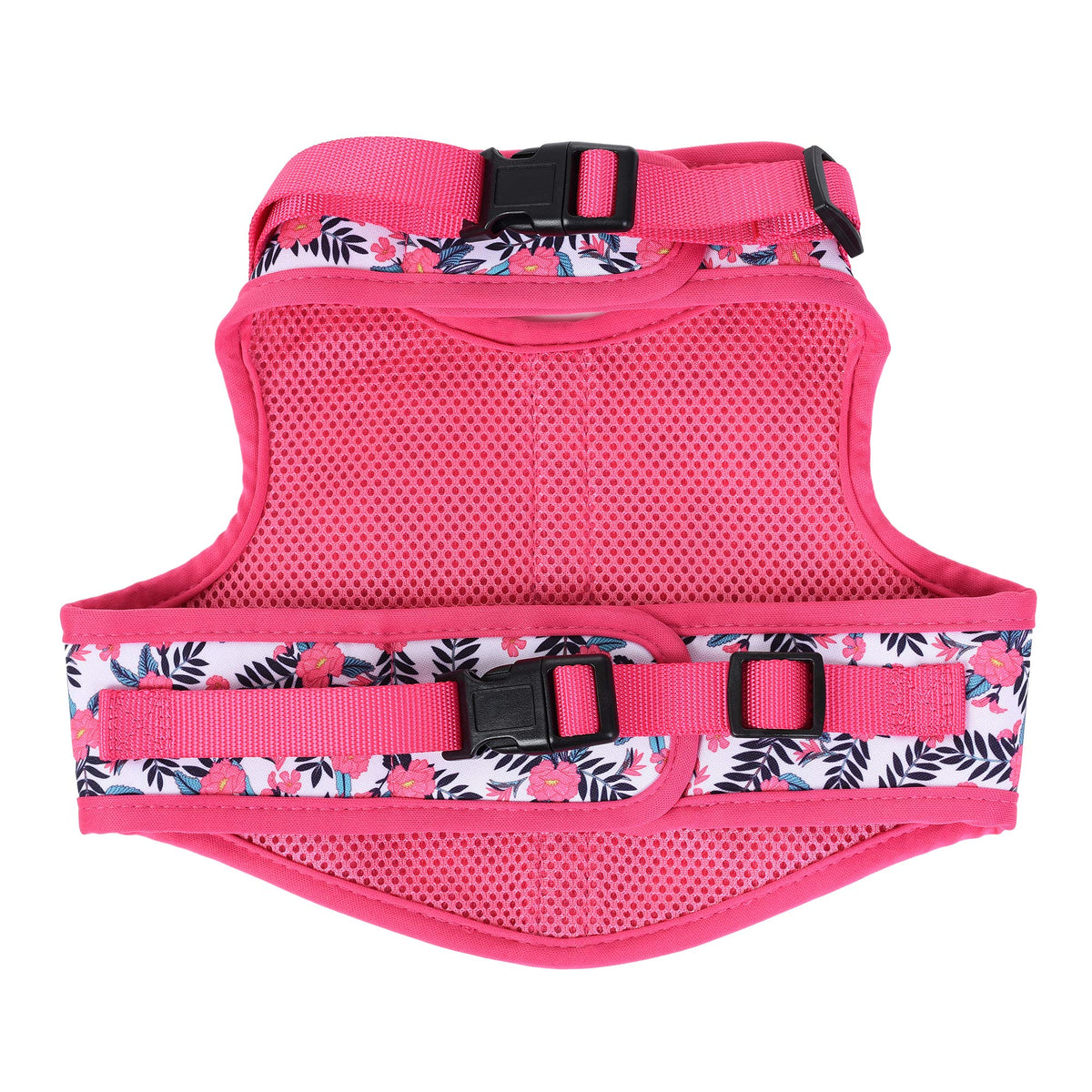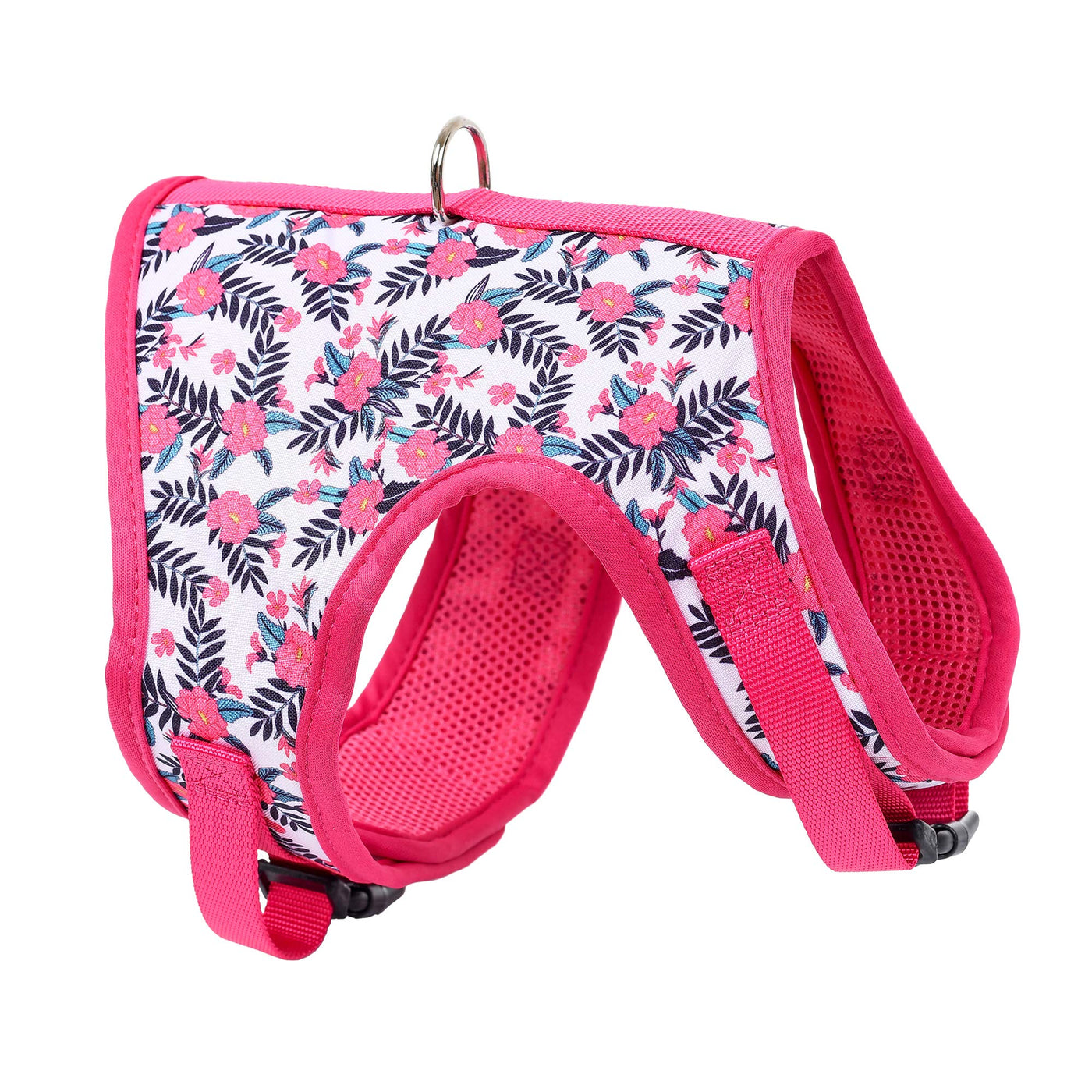 Q: What materials are used in the construction of the vest harness?A: The vest harness is made from 100% polyester, featuring a breathable air mesh lining and a floral printed exterior that provides both style and comfort for your pet.