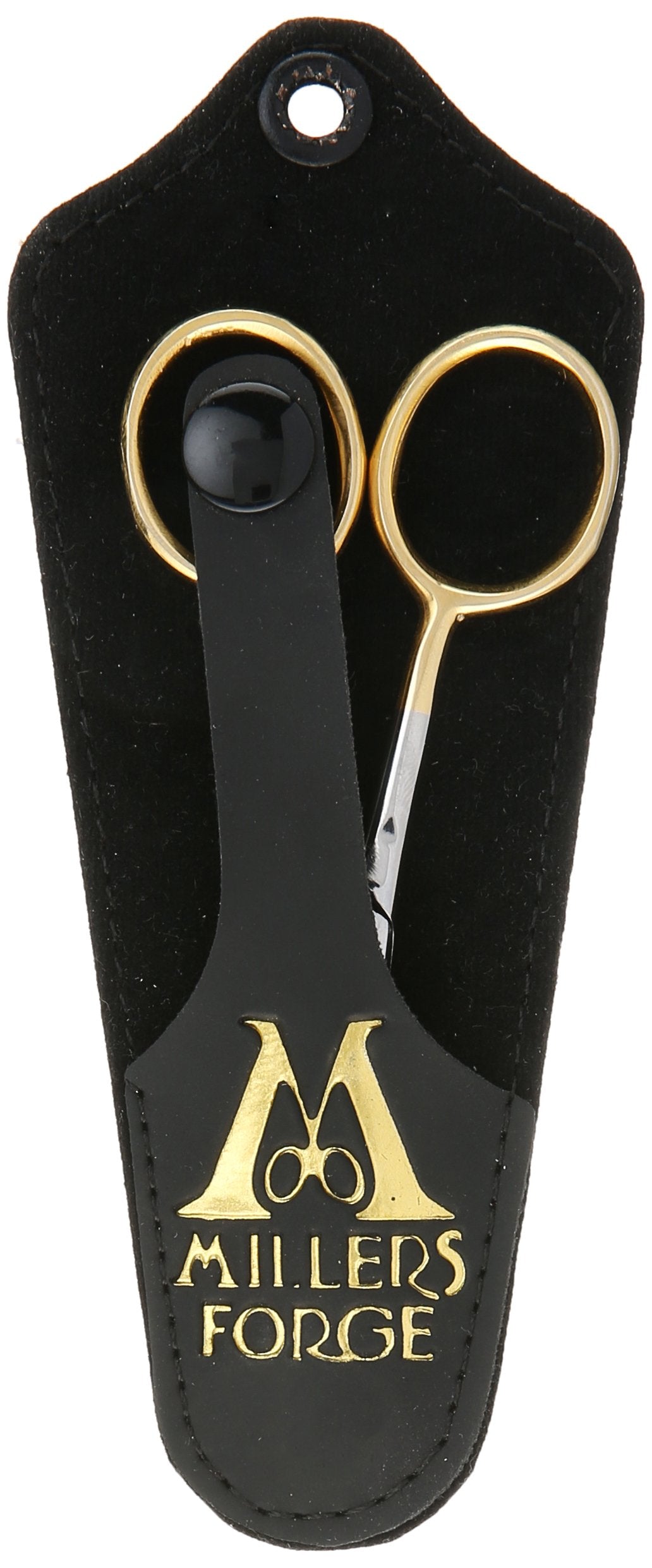 Q: What are the main features of the Millers Forge Feather Light Ear/Nose Shear?A: The Millers Forge Feather Light Ear/Nose Shear features ice tempered stainless steel blades for durability and precision, gold plated handles for a touch of elegance, a finger rest for comfort and control, and an ultra-light design to reduce wrist strain during use. It also comes with a custom pouch for easy storage.