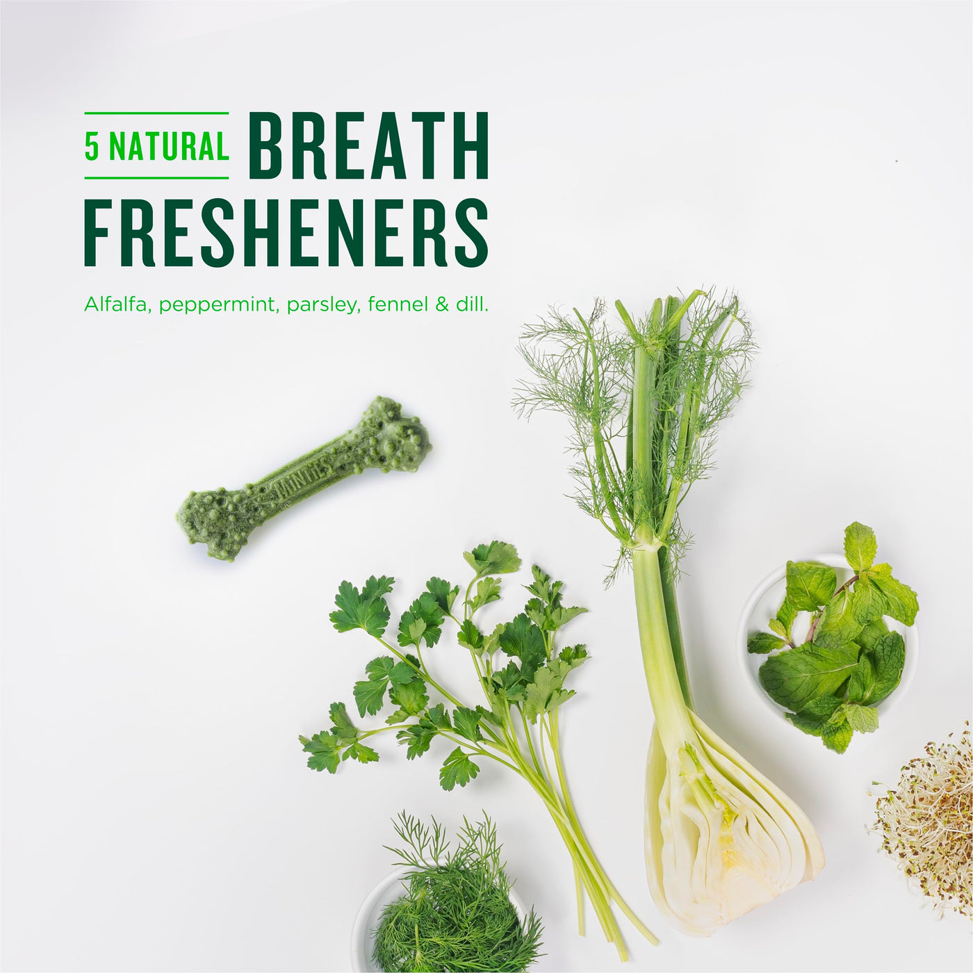 - Q: What ingredients are in Minties Dental Chews for Dogs? A: Minties Dental Chews contain five natural breath fresheners: peppermint, parsley, fennel, dill, and alfalfa. They are made without corn, wheat, soy, and added sugars or salts.