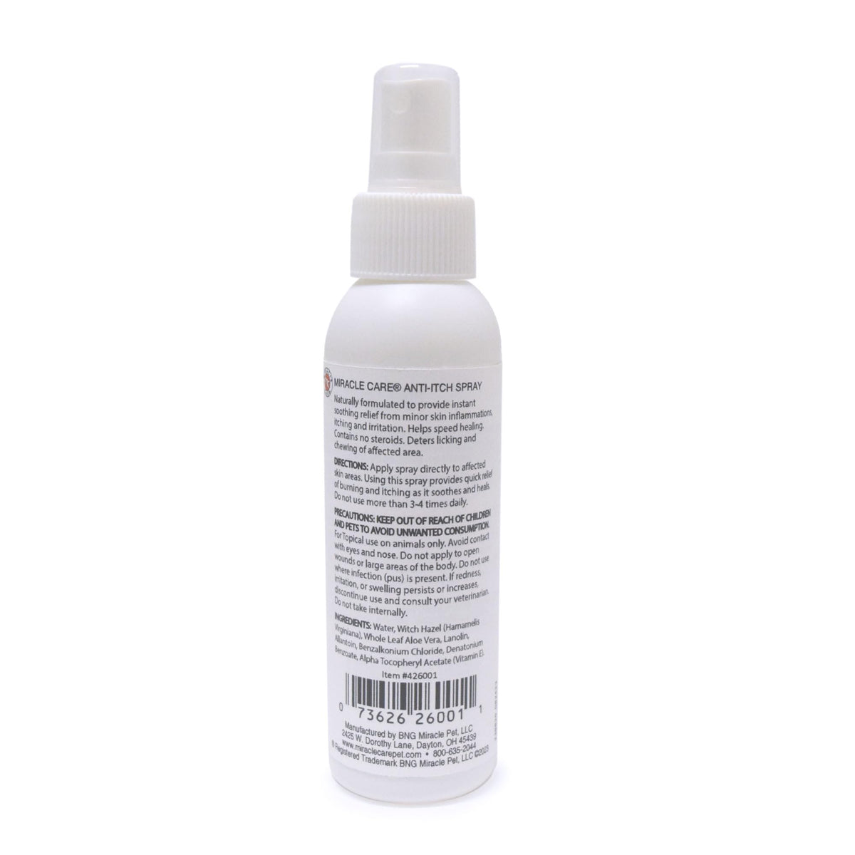 Miracle Care Anti-Itch Spray is naturally formulated and provides soothing relief caused by minor skin itching and irritations.Bitter taste discourages licking and bitingSoothes skin irritation from itchingSteroid free formulaNaturally formulated with Witch Hazel and Aloe VeraProudly Made in the USANote: For use on dogs and cats.