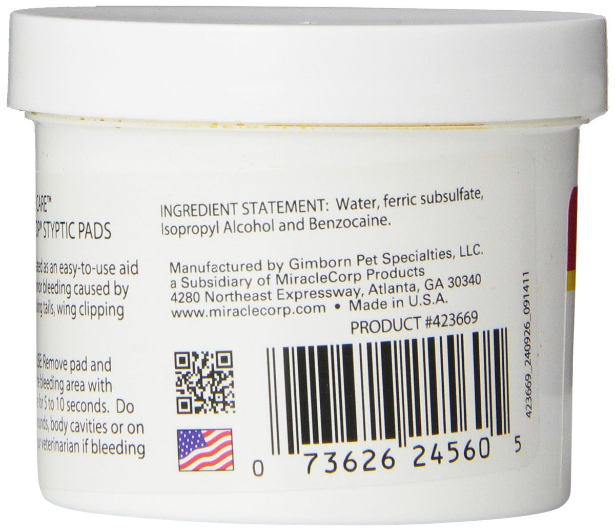 Q: What are Miracle Care Kwik Stop Styptic Pads used for?A: Miracle Care Kwik Stop Styptic Pads are designed to quickly stop bleeding for pets, including dogs, cats, and birds. They are particularly effective for use during nail clipping, minor cuts, and grooming.