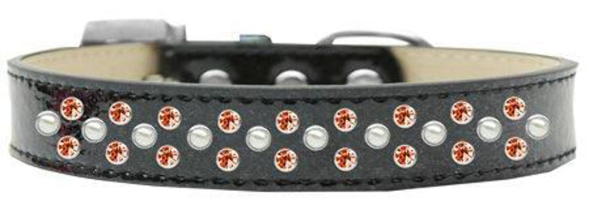 Q: What is the collar made of?A: The collar features a 3/4" wide design adorned with pearl and orange crystals, but specific material details are not provided.