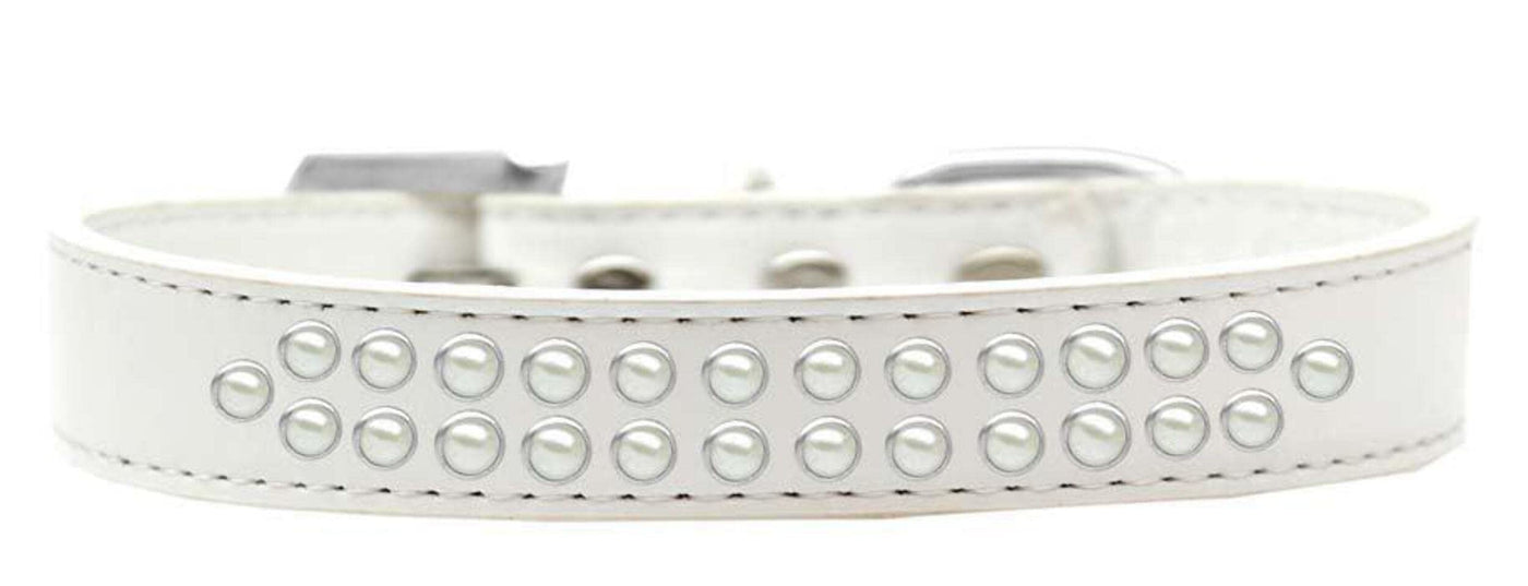 3/4'' wide collar adorned with 2 rows of pearls and a rhinestone buckle