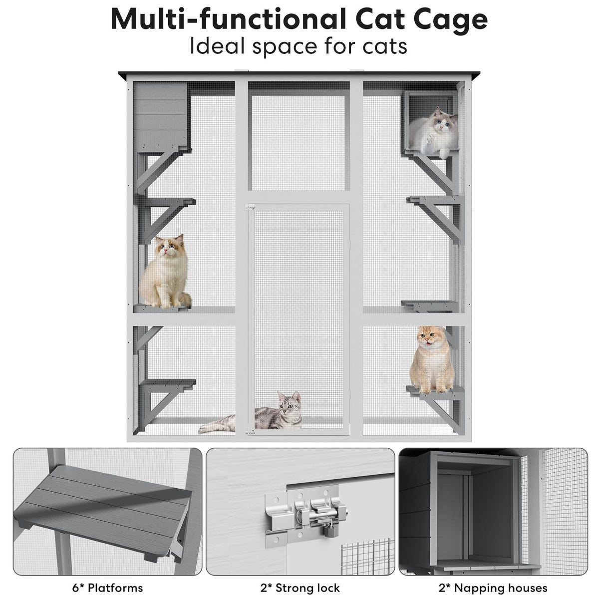 Miscoos Outdoor Wooden Cat Catio - Large Solid Wood Cat Cage Playpen With 8 Jumping Platforms & 2 Napping Houses, Walk-In Cat Ke