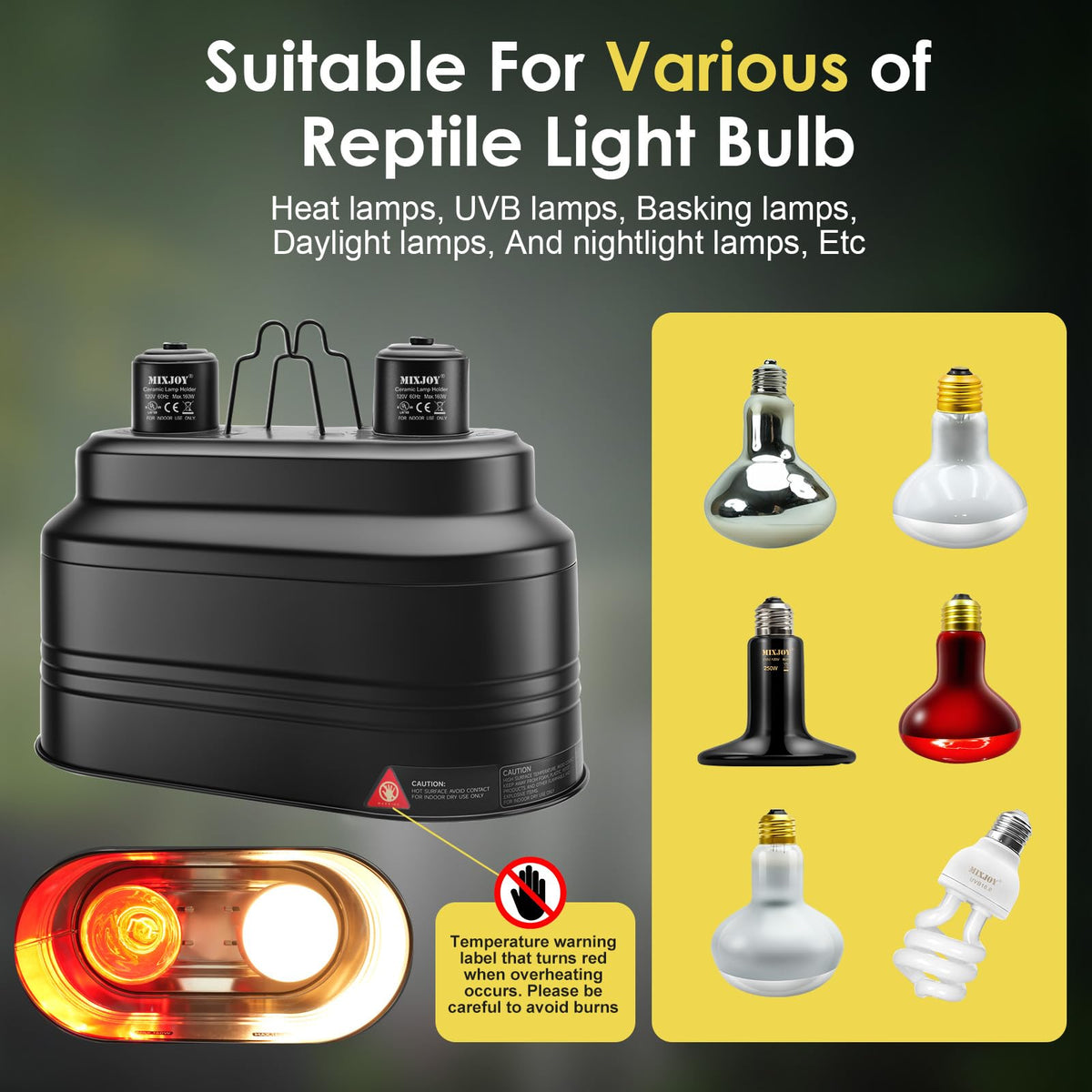 Why Choose Mixjoy Dual Reptile Light Fixture? Comprehensive Care: Combines Essential Uvb Lighting And Heating In A Single Fixture For A Healthier, Happier Reptile. Safety First: Designed With Safety Features Like Heat-Resistant Sockets And A Temperature Warning Label To Ensure Your Pets Well-Being. Long-Lasting Performance: Built From Premium Materials For Durability And Efficient Heat Dissipation. Specifications: Material: Heat-Resistant Metal Housing Max Wattage: 160W Per Socket (Supports Two Bulbs) Voltage: (Insert Voltage, E.G., 110-120V) Bulb Compatibility: Uvb Lamps, Heat Lamps, Basking Lamps, Daylight Bulbs, Nightlights, And Infrared Bulbs (Bulbs Not Included) Switches: Independent On/Off Switches For Each Bulb