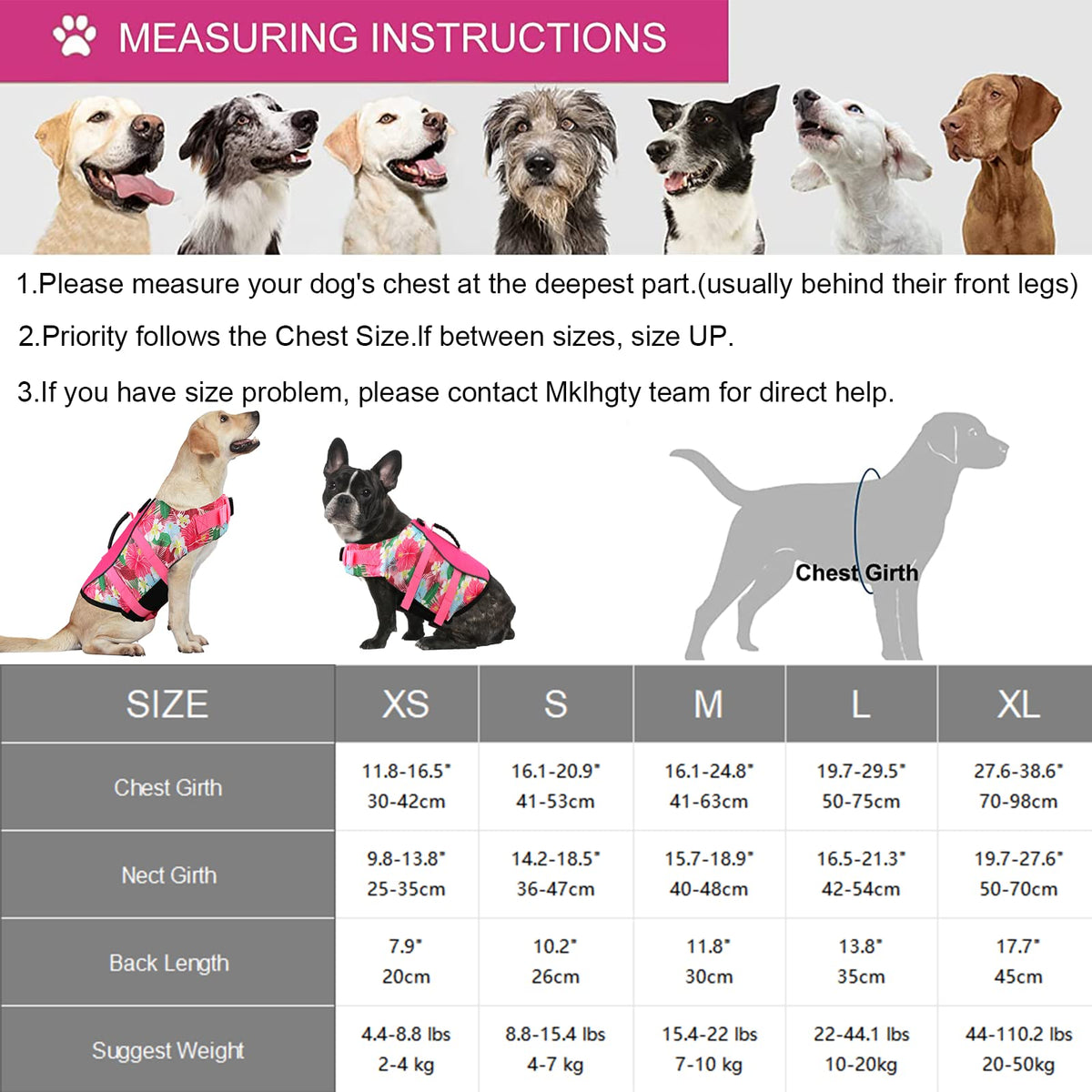SAFETY: Mklhgty dog life jacket is suited for all kinds of summer water activities. Some dogs may take risks and run away from you when playing in the water Mklhgty dog life vest with reflective strips and bright colors aid in locating your dog