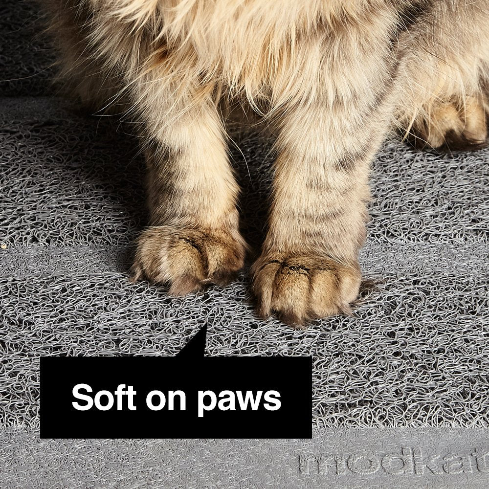Q: Will my cat be comfortable walking on this mat?A: Absolutely! The Modkat Litter Mat features a soft, cushioned surface that is gentle on your cat's paws, providing a comfortable walking experience while they exit the litter box.