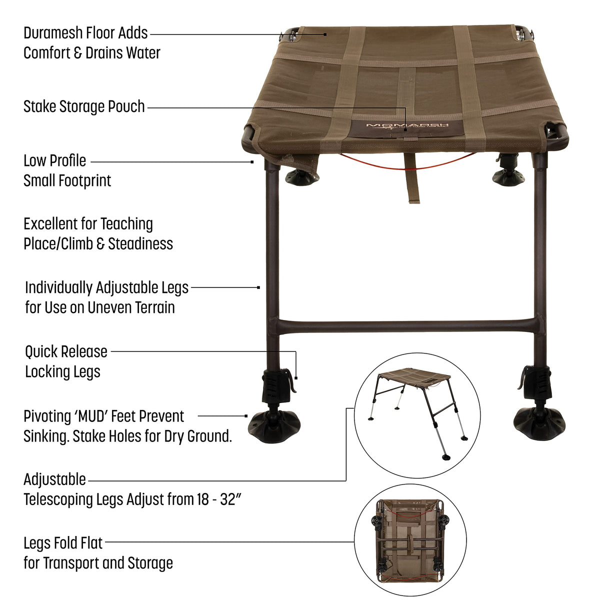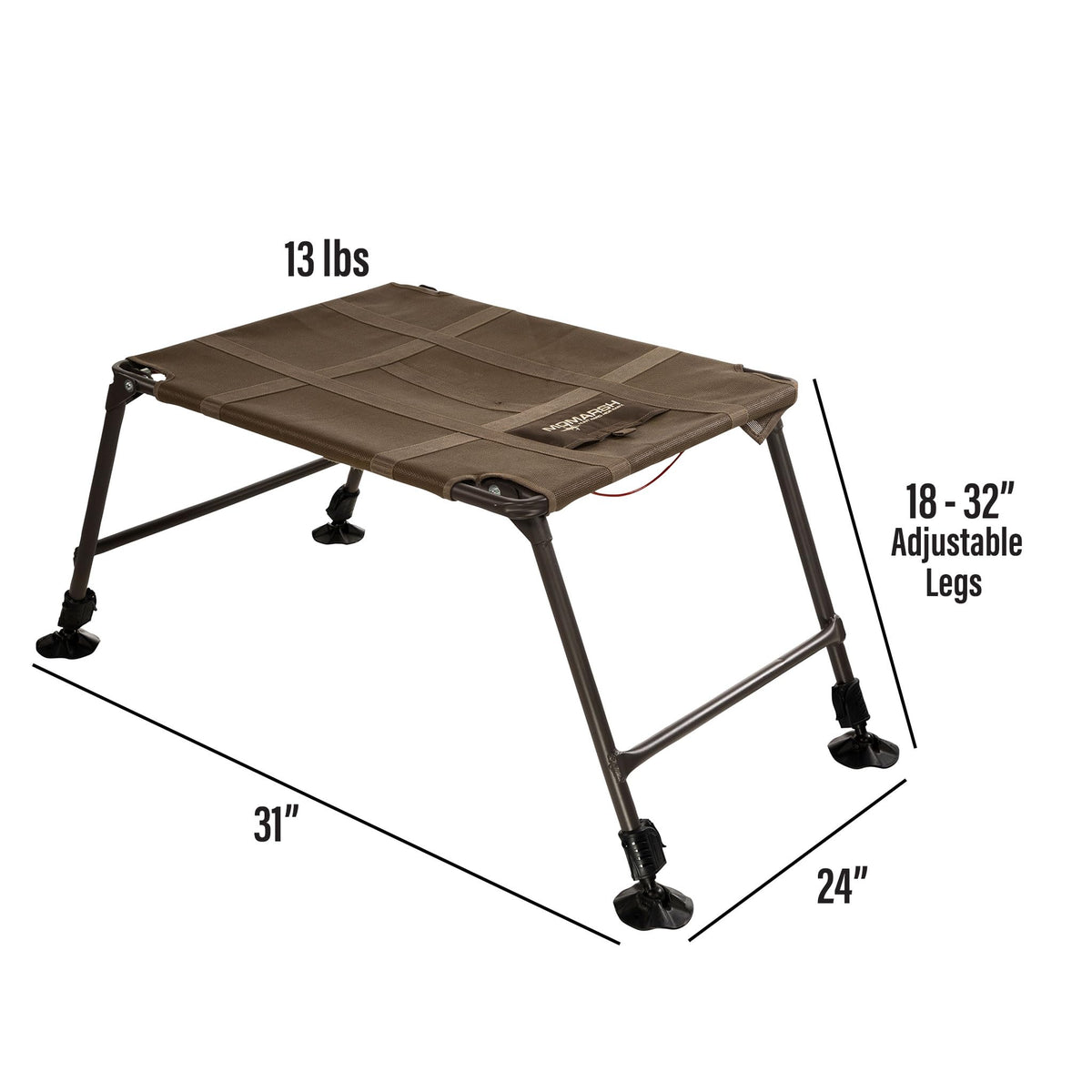 INDEPENDENT adjustable legs allow for stable platform on any surface & adjust from 18-32 inches. | LIGHTWEIGHT design at 9 lbs. allows for easy transport by folding legs flat. | FEATURES Duramesh draining platform, mud feet for stability, Quick Release locking legs & integrated stake storage pouch. | DIMENSIONS of platform are 31 X 24 inches | PERFECT for Hunting & numerous training scenarios such as, place training, climbing & steadiness.