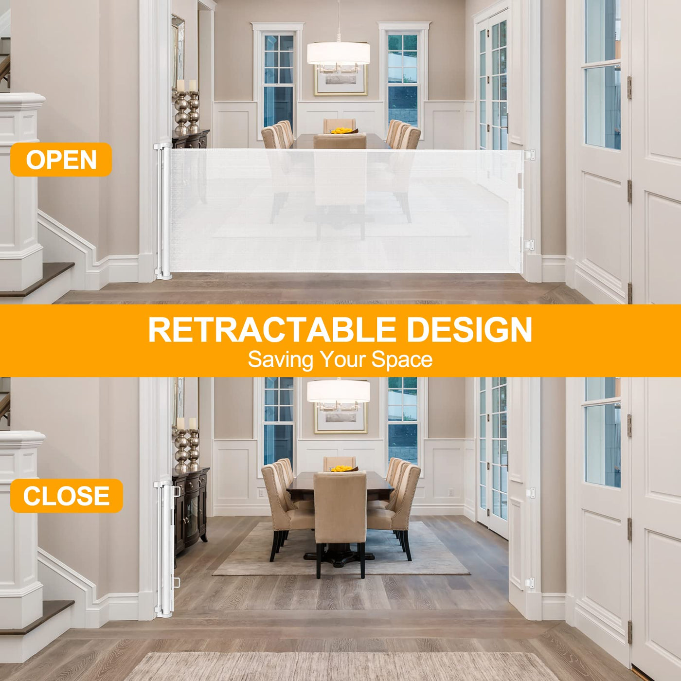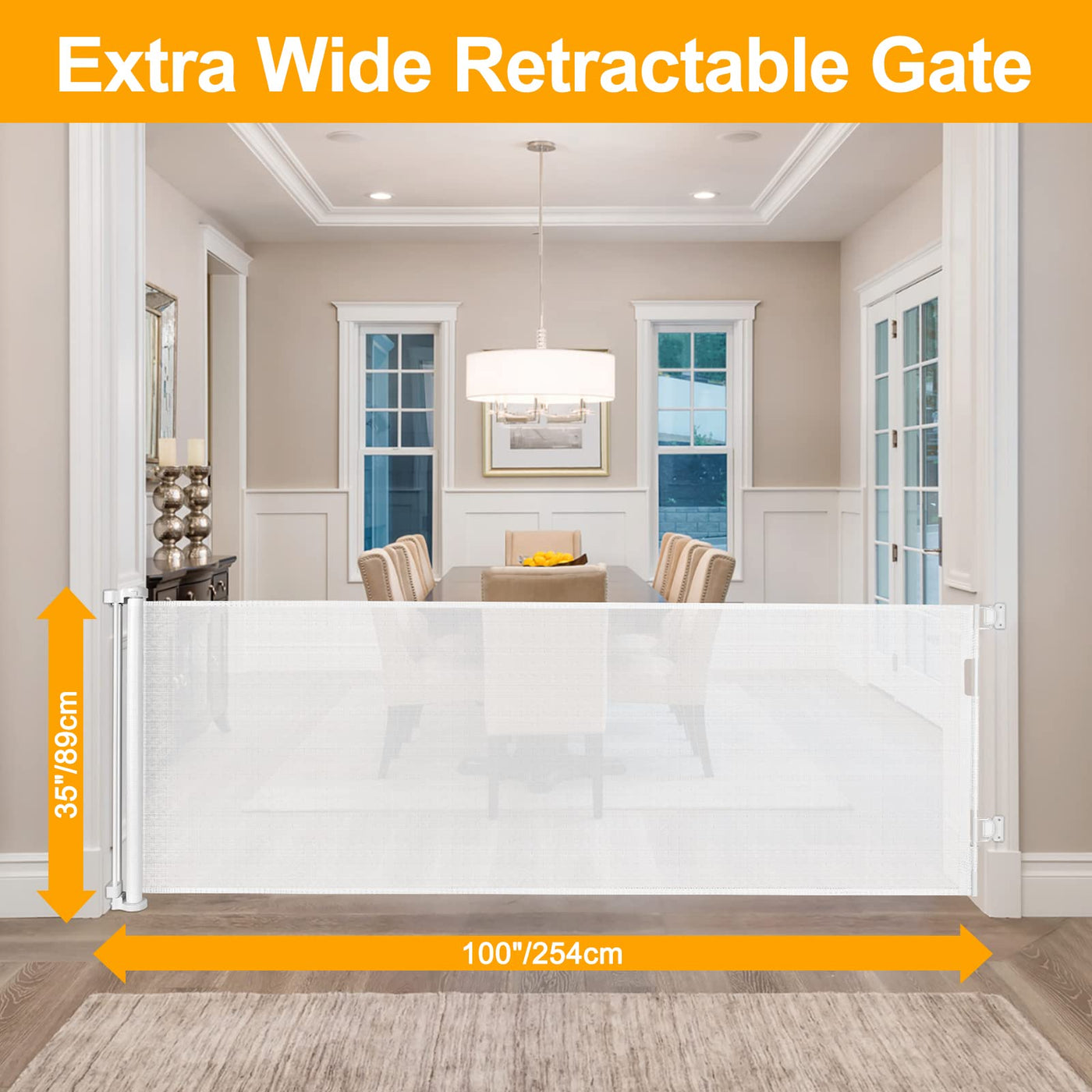 Spacious room always requires a super wide baby gate, but metal baby gates are common on the market. Metal dog gates come with lots of cons, for example, we cant roll it up, which occupies space. In addition, it is easy for children to be stumbled and it is hard for wheelchairs to pass through. It is obtrusive and fails to blend into your home style. Hence, WHMHOM newly designed this long baby gates indoor extra long dog gate. You can roll it up when not in use, which wont occupy much space. Children and wheelchairs are easy to pass through, and elegant design works well with your home style. It is effective to stop your children from entering dangerous space. In addition to be a toddler gate, WOMHOM retractable mesh gate also works well as a semi-enclosed play yard, barrier and room divider. You can flexibly divide some space for your children and pets. Before purchasing WOMHOM dog gates for the house extra wide, maybe you need to purchase gas stove cover, oven lock, cabinet lock and refrigerator lock to prevent your children from opening home appliances in the kitchen that may cause dangers. But you now have a new choice! Just purchase WOMHOM extra wide baby gates for doorways. Throw away all items involving child safety protection and ensure your childrens safety with the help of a extra wide gates for kids! 1.This child gate for doorway Fits openings up to 100'' wide and is 35'' tall which can be adjusted to fit your openings according to your needs. 2.The long gates for kids or pets is easy to use in high traffic areas, and the baby proofing mesh pet gate can be completely retracted when not in use without taking up a large space. 3.Fits Any Baseboard: No need to buy extra spacers, our mesh baby gate accessories can be adjusted up and down to fit Any Baseboard. 4.One-Handed Operation: the gates for dogs indoor gate can easily open and close the gate with one hand while holding the baby.