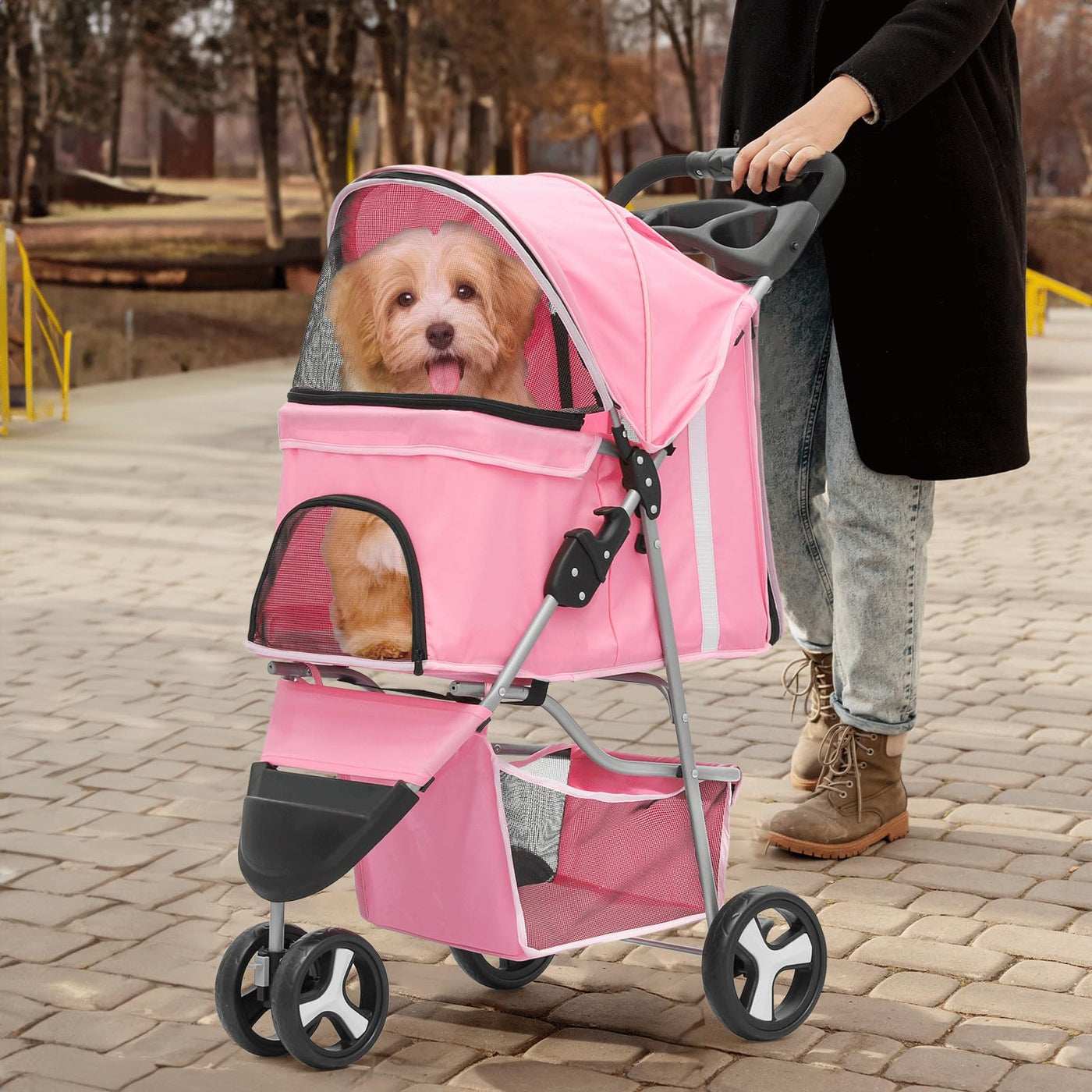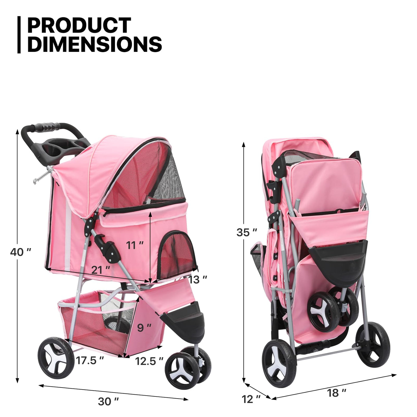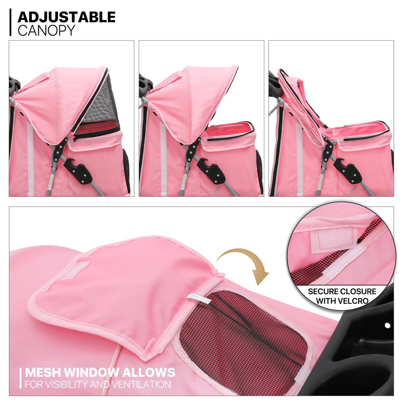 Monibloom 3-Wheels Foldable Pet Stroller With Waterproof Cover, Pet Strolling Cart For Small/Medium Dogs And Cats With Storage Basket And Cup Holder, Breathable And Visible Mesh For All-Season, Pink