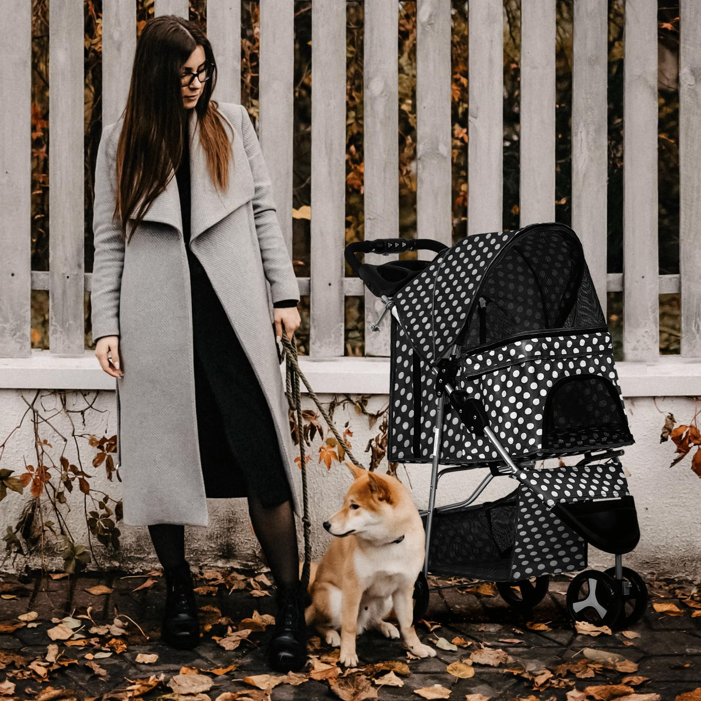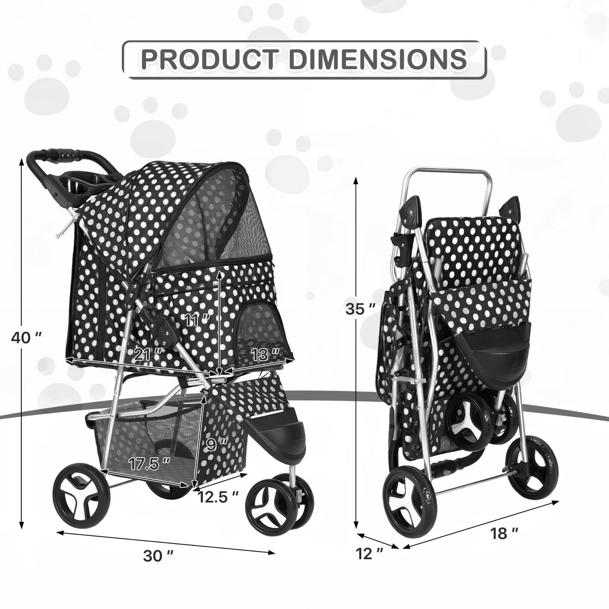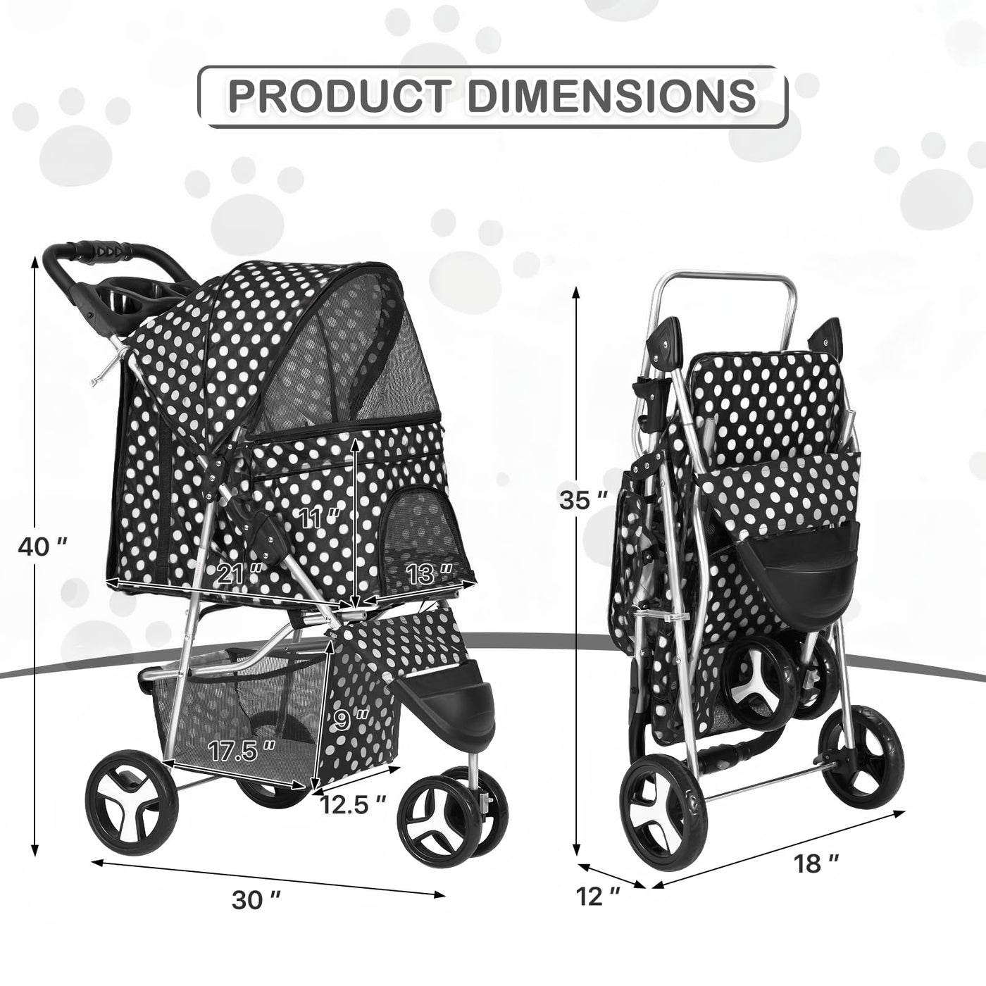 Monibloom 3 Wheels Pet Dog Cat Stroller For Small Medium Dogs Cats, Foldable Jogger Stroller W/Storage Basket And Cup Holder, Black Polka Dots