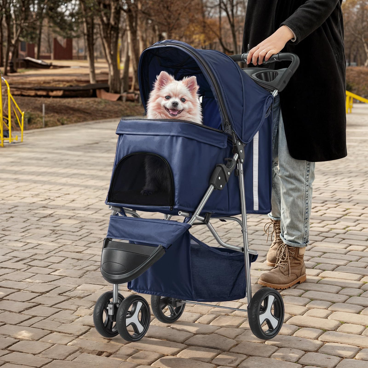 Monibloom 3 Wheels Pet Stroller, Foldable Dog Cat Cage Jogger Stroller With Weather Cover For All-Season, Storage Basket And Cup Holder, Breathable And Visible Mesh For Small/Medium Pets, Blue