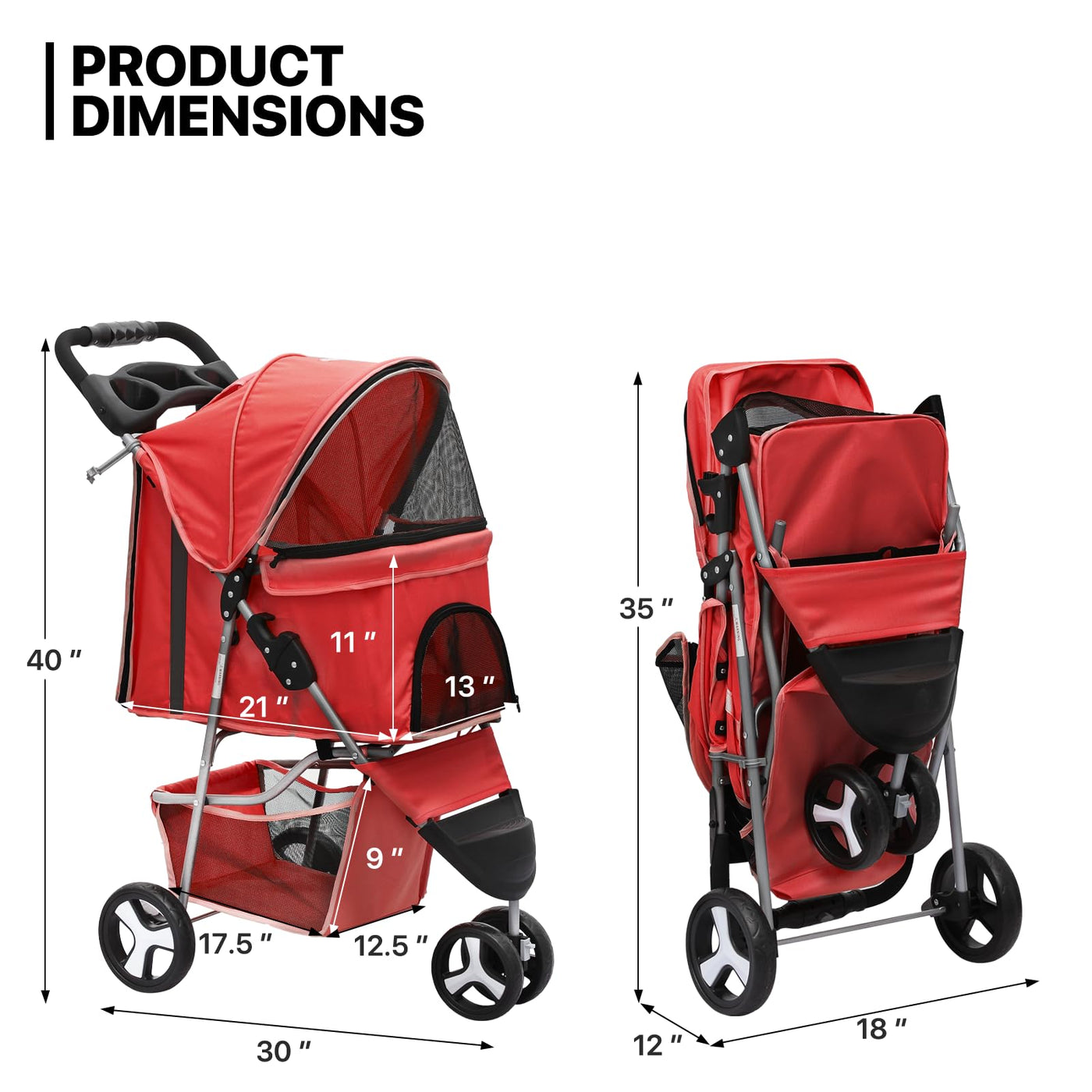 Monibloom 3 Wheels Pet Stroller, Foldable Puppy Cage Jogger Stroller With Weather Cover For All-Season, Storage Basket And Cup Holder, Breathable And Visible Mesh For Small/Medium Pets, Red