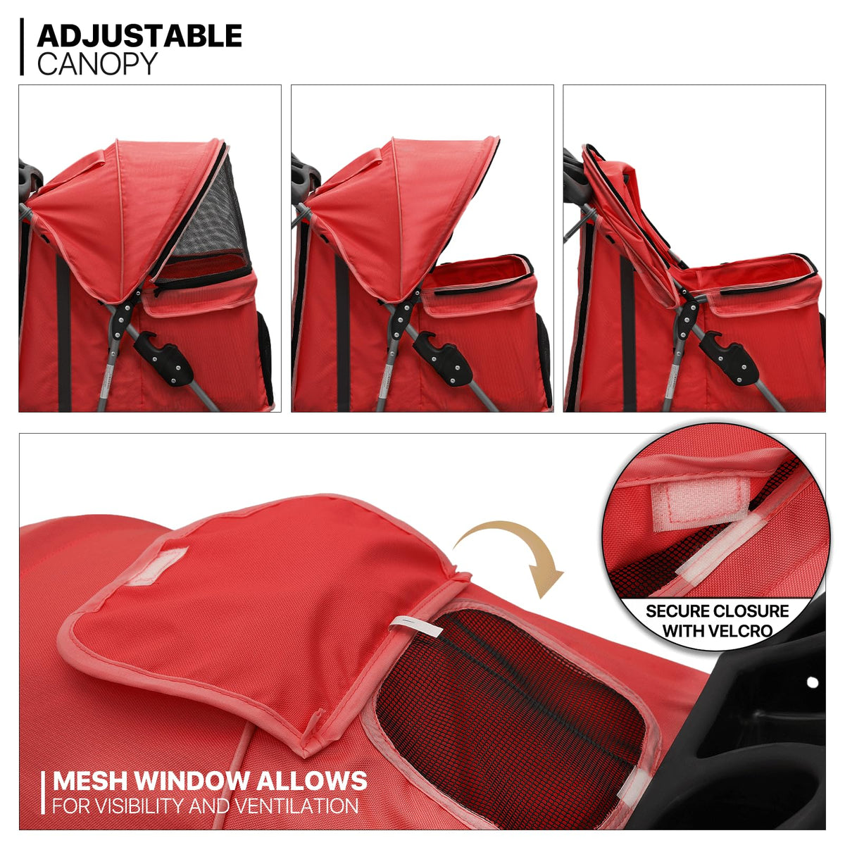 Conveniently Collapsible Design - This dog stroller is the perfect solution for smaller or older pets who can't handle long walks. The collapsible design makes it ideal for travel and camping, and the lightweight yet sturdy support means you won't have to worry about anything. | Sturdy and Safe - Our pet stroller is equipped with breathable mesh windows that allow your furry friend to see and breathe easily. The Oxford cloth material is water-resistant and durable, ensuring your pet's safety and comfort. | Humanized Design - With convenient features like swivel front wheels, cup holders, and a hooded peak-top window, this pet stroller makes taking your pet out for exercise and fresh air an easy and enjoyable experience. The roomy design and undercarriage storage basket give you plenty of space to carry your essentials, too. | Advanced Braking System - The two rear wheels of our pet stroller are equipped with brake protection devices, so you can park your stroller safely and securely even on inclined surfaces. | Durable and Comfortable - Made of tough Oxford cloth and able to hold up to 33 lbs, our dog stroller is not only water-resistant but also provides added comfort with a padded foam bottom that your furry friend is sure to appreciate. | Flexible Wheels - Finally, the 360° swiveling front wheel with a shock absorber ensures that your pet has a smooth ride even on the roughest terrain. The rear two wheels also feature brakes, making this stroller a perfect fit for injured or senior dogs or puppies that need a little extra TLC.