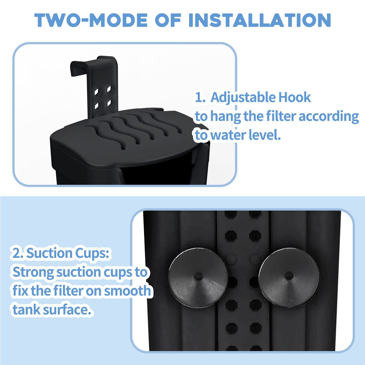 [TWO-INSTALLATION MODES] 1. Adjustable Hook to hang the filter according to water level. 2. Suction Cups: Strong suction cups to fix the filter on smooth tank surface. Any questions please feel free to contact us we will provide the best service to you.