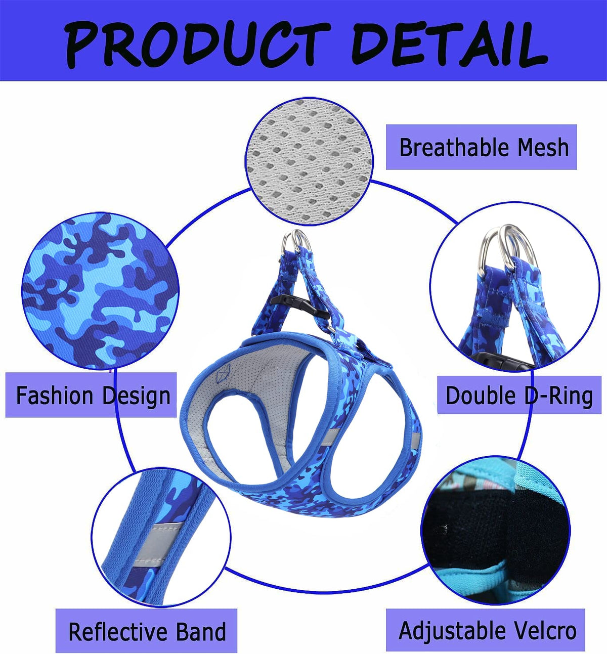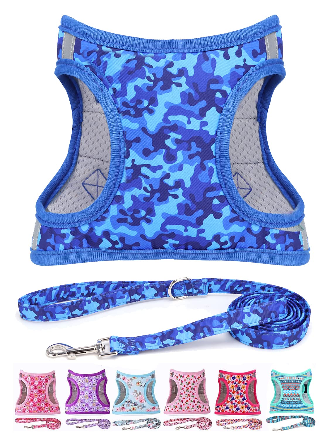 Moonpet Step In Boy Dog Harness Leash Set- All Weather Reflective No-Pull Padded Mesh Vest Harness For Cats Puppy Extra-Small Small Medium Large Dogs - Blue Camouflage - M