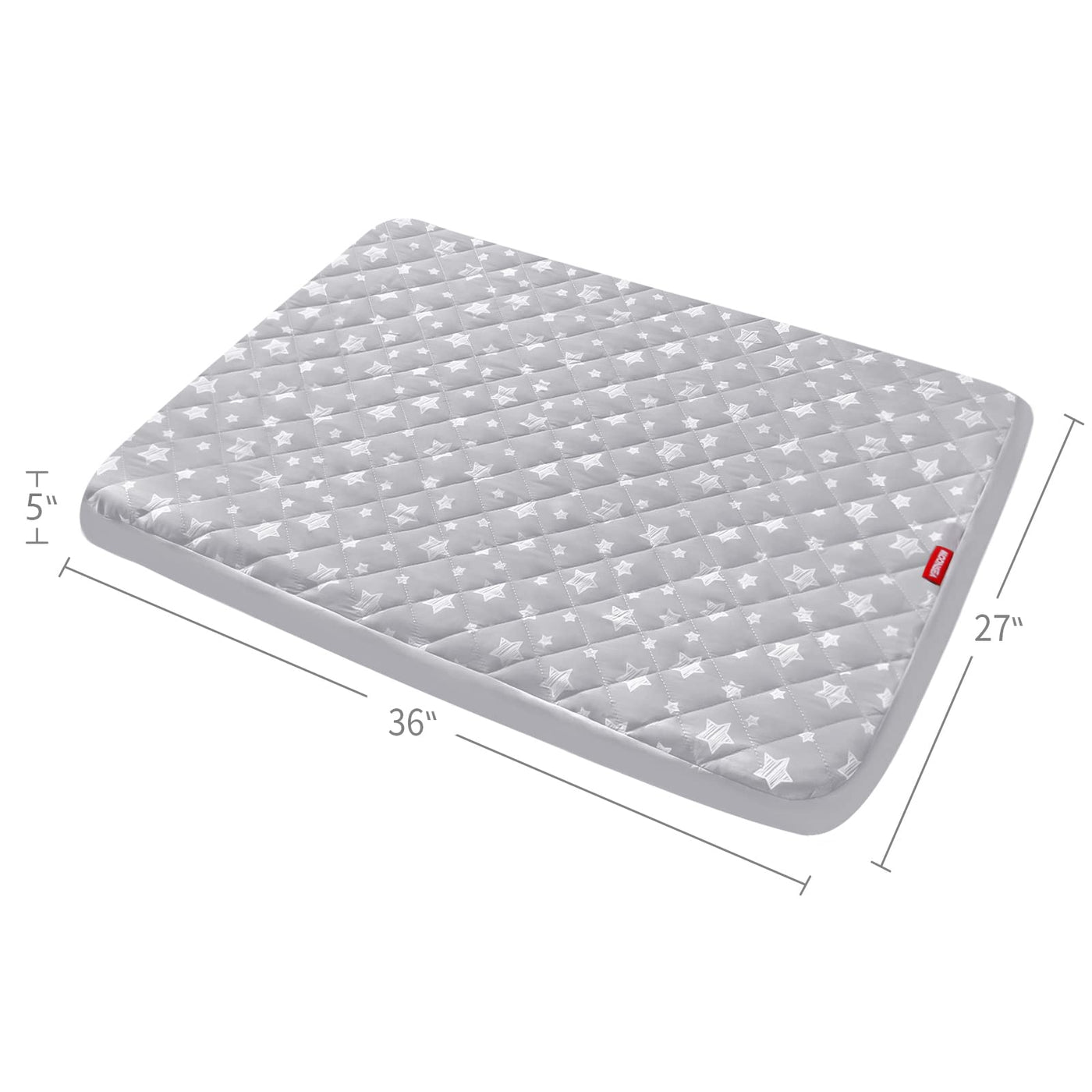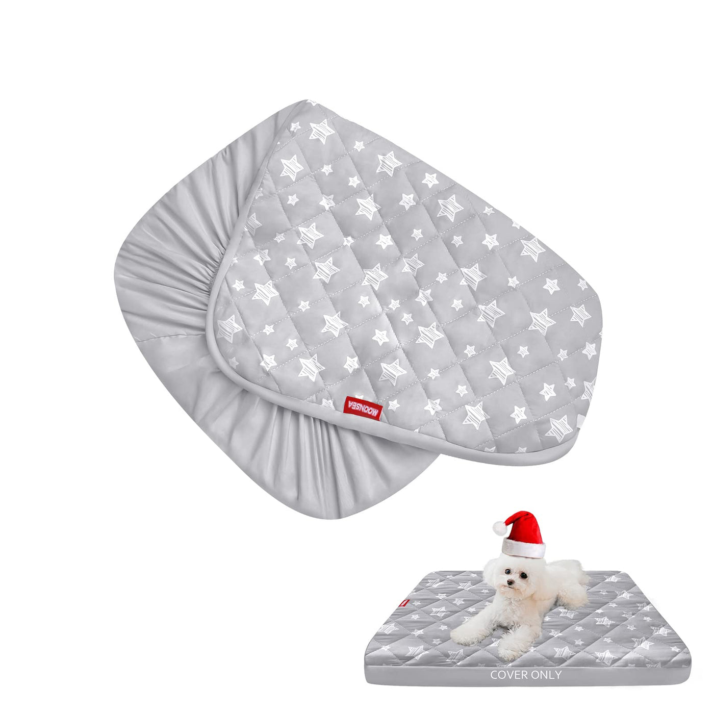 Waterproof and cushioning Material: Our dog bed cover is made of premium microfiber surface quilted with soft filling for cushioning and the bottom of this dog bed cover are premium waterproof layer material (PU) which can keep any liquid from leaking into your dog bed These dog bed cover are made in our manufactory which are certified OEKO-TEX Standard 100 It means an independent certification system that ensures textiles meet high safety and environmental standards Lovely Print with Super Soft Quilted Fabric: The dog bed cover made of light grey with star print fabric different from most solid color dog bed covers on the market In addition premium microfiber quilted surface provides a soft tactile experience for your pet Flexible Fit: Dog bed cover with elastic band design fits the dog bed tightly measures 27x36 inch pet bed (fits up to 5 deep) The dog bed cover can be put on easily and removed conveniently which fits most standard pet beds whether round and rectangular Durable and Machine Washable: Tired of the pet beds that difficult to clean Try this machine washable stronger cover which can provide the truly easy to clean And this dog bed cover is very durable use which can be washed more than 100 times Moonsea guarantee: The product quality you can trust so you can buy at ease If there is any problem with dog bed cover please contact us and we can replace for you or money back without excuses