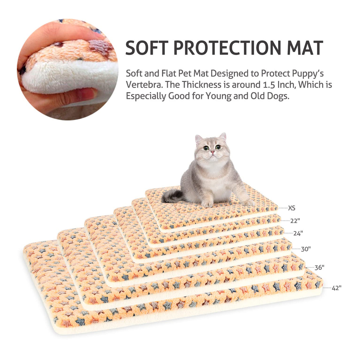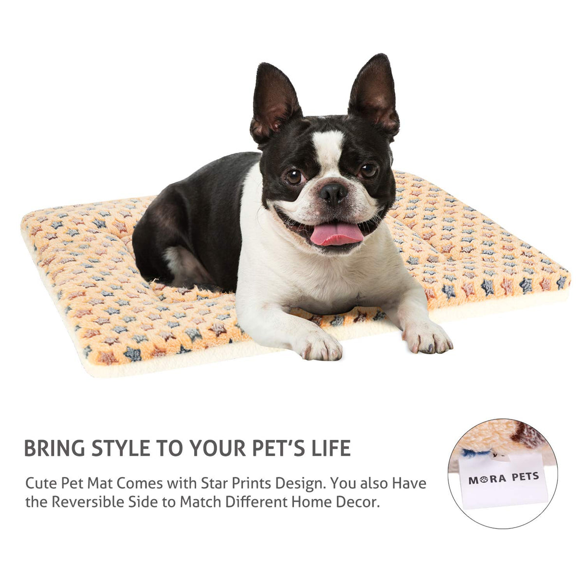 Q: What makes the Mora Pets Dog Bed Crate Pad different from other pet beds?A: The Mora Pets Dog Bed Crate Pad offers a dual-sided design with a cute star print and a traditional milky color, allowing you to switch up the look. It also provides excellent support for pets with its cotton padding, making it suitable for both young and older pets.