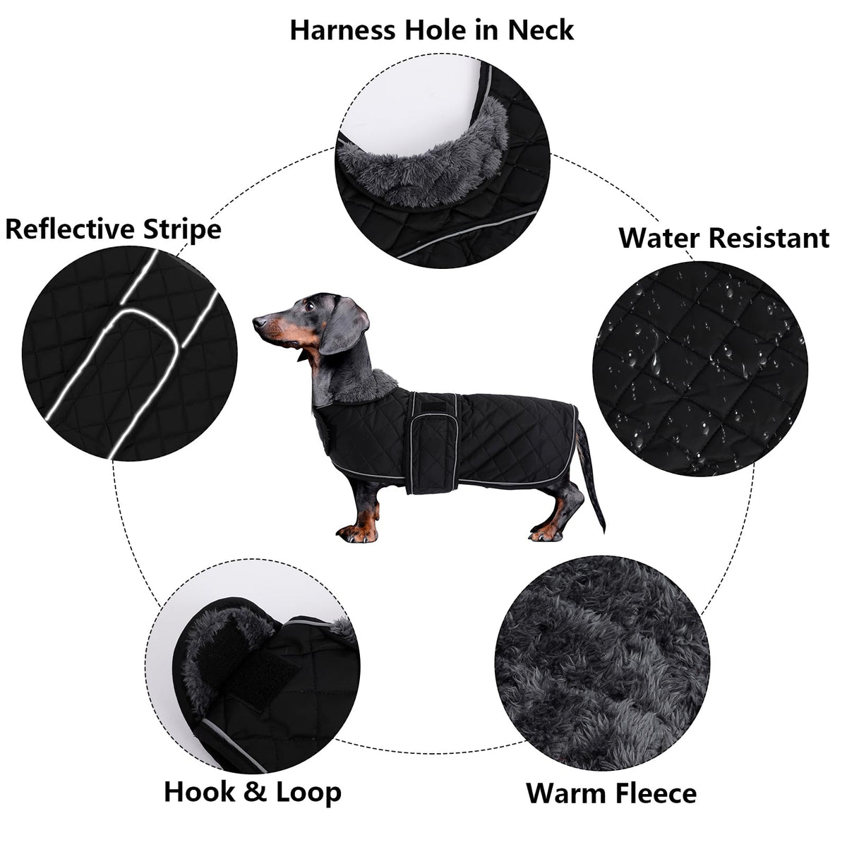 Q: Does the coat have a harness hole?A: Yes, the Morezi Dachshund Coat features a small opening on the upper back, allowing you to easily attach a harness while keeping your dog comfortable and secure.