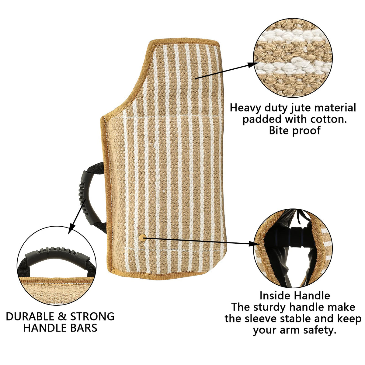 Feature Of Training Biting Tugging Toy: 1. This Bite Sleeves Protect Arms And Hands From Animal Bites And Scratches, While Leaving Fingers Free For Easier Maneuverability, Perfect For Teaching Young Dogs. 2. This Dog Training Sleeve Is Made Of Jute Material Padded With Jute Felt And Lined With Jute Material And Can Give Your Dog A Good Bite At The Same Time Your Arm Is Breathable. 3. It Provides The Necessary Support And Protection From Hard Bites Very Protective Of The Arm. Size Chart Length: 19.7In (50Cm) --- Width: 11.8In (30Cm) Warm Tips: 1.Not For Aggressive Dogs. 2.This Toy Should Be Regularly Inspected To Ensure There Is No Damage. If Any Damage Is Seen The Toy Should Then Be Discarded. 3.Suitable Size Of Toys Is Necessary.With The Growth Of Dogs,The Small Toys Should Be Eliminated. 4.Tug Toys Are Meant For Interactive Tugging Between You And Your Dog Only, Not Chew Toys. We Strongly Recommend That You Do Not Allow Your Dog To Keep The Toy After Interaction Has Finished. 5.For Cleaning, The Dog Training Sleeve Are Hand Washable And Dried Naturally In The Air. About Morezi Morezi Brand Is A Company Specialized In Pet Supplies. With The High Quality Of Workmanships And Materials, We Hope That Pet Owners And Pets Will Enjoy A Leisure Time. We Will Try Our Best To Improve Our Services, As Customer Satisfaction Is At The Core Of Our Business.