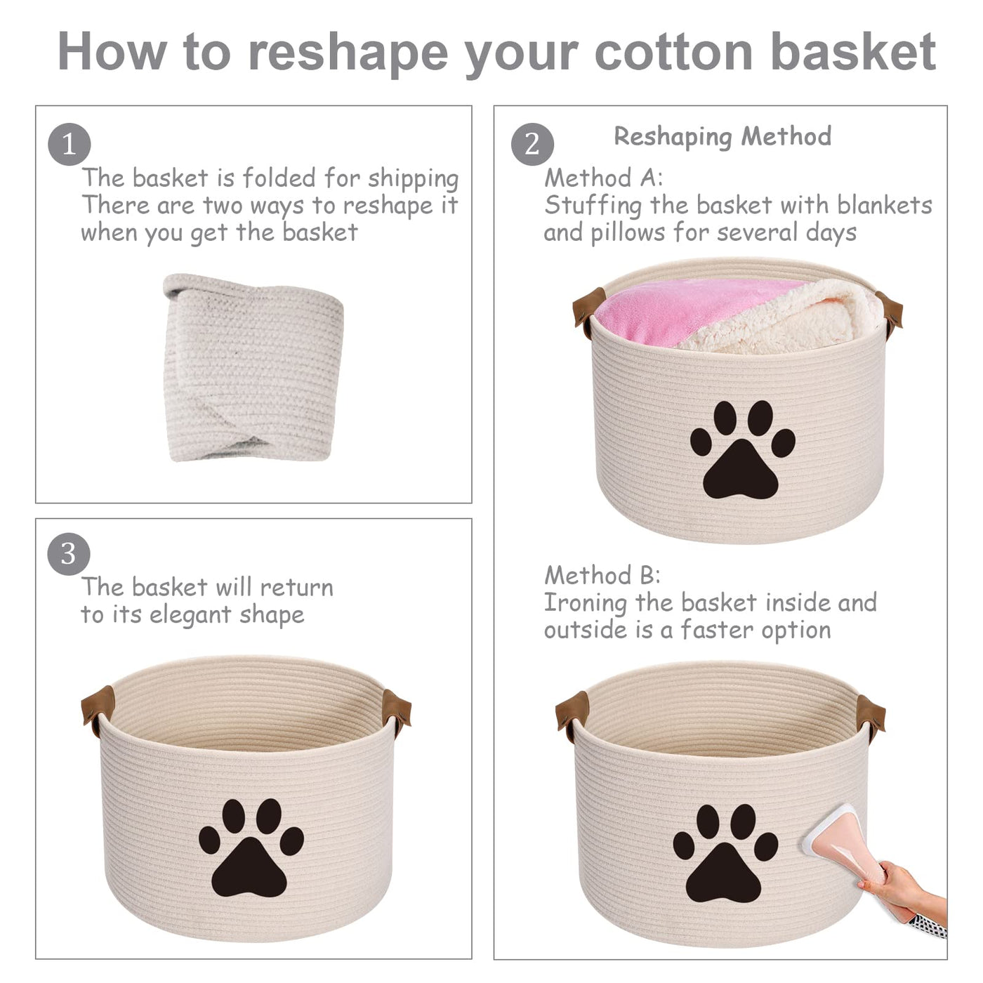 Functionalty: 1. This PET TOY STORAGE BASKET Perfect for Organizing Toy Storage, Dog Toys, Cat Toys. 2. You truly never see such a beautiful mix of function and fashion. 3. The beige allows this set to fit in within any decor or any room in the house and keeping your living area clean and clutter free. 4. Toy basket is made from cotton rope, lightweight with handles. Wash by hand or just throw it in washing machine. The baskets can be steam ironed to remove wrinkles since they are folded when shipped or washed. 5. These beautiful containers will bring a smile to your face every time you see it - and your pets will go wild for them: although that may not necessarily be because of how beautiful they are. 7. Just the right sizes! Large enough to fit a nice amount of toys - but not so big or bulky as to take up too much space or be an eyesore. These dog cat toy bin storage are seriously beautiful.