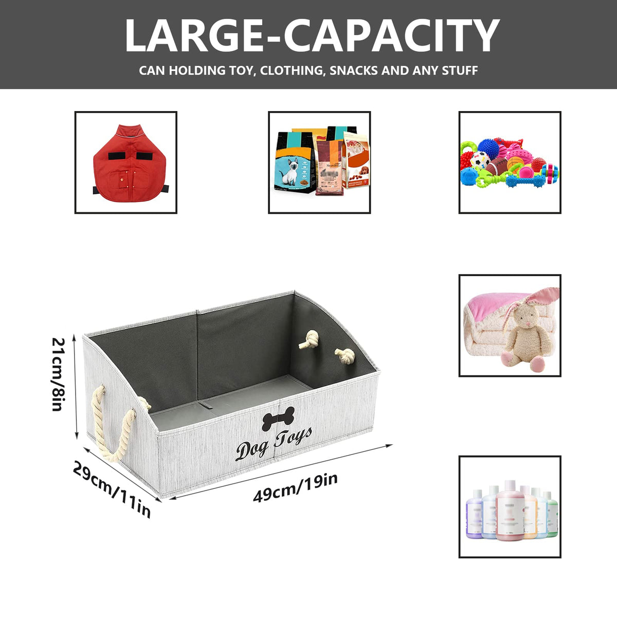 Q: What are the dimensions of the Morezi Large dog toy bin?A: The Morezi Large dog toy bin measures 19.7" in length, 11.2" in width, and 8.3" in height (50cm x 28.5cm x 21cm), making it spacious enough to hold plenty of toys while remaining compact.