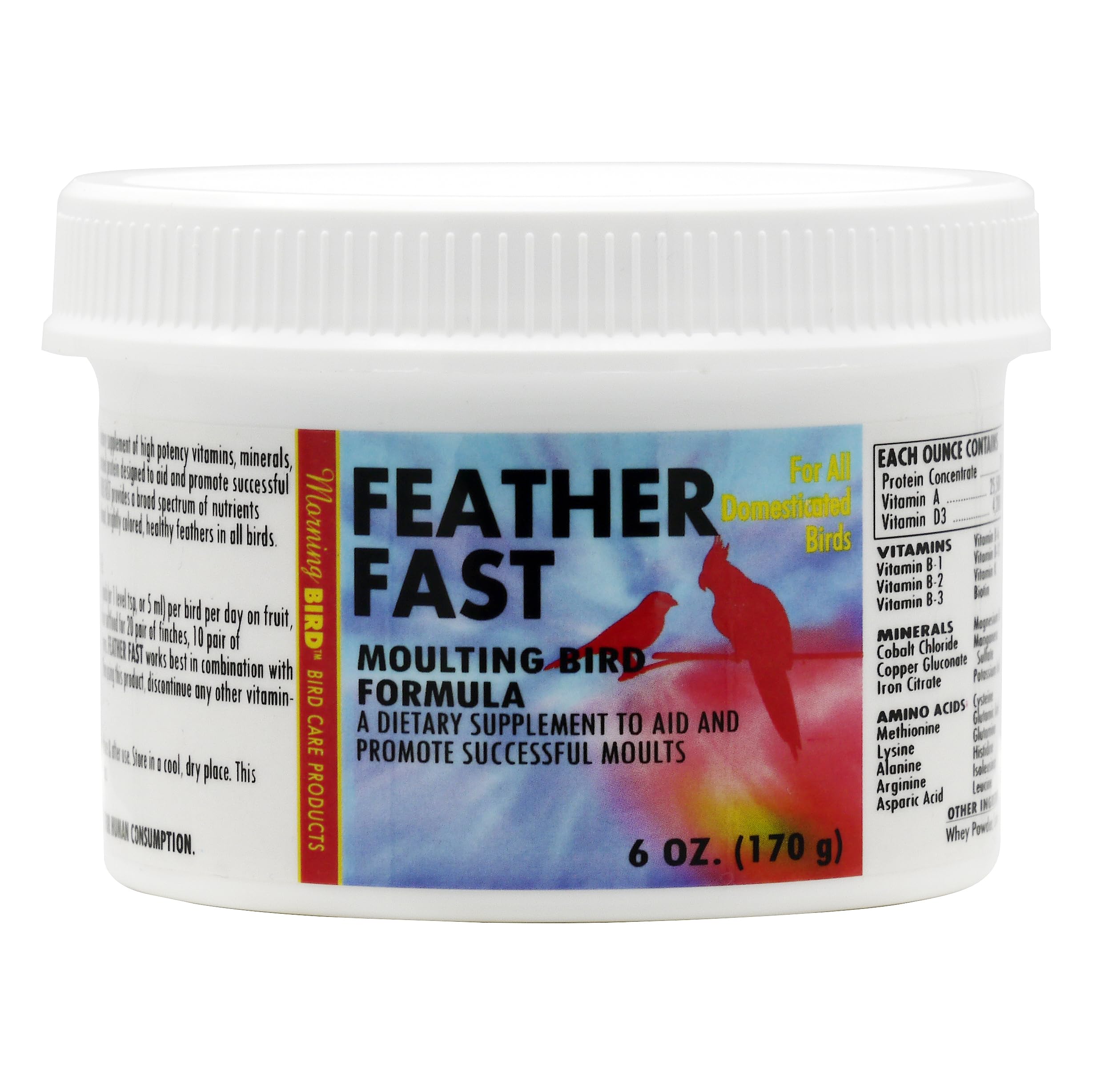 Morning Bird FEATHER FAST is a dietary supplement of high potency vitamin, mineral, amino acid and concentrated protein designed to aid and promote successful moults in all birds. FEATHER FAST provides a broad spectrum of nutrients necessary to produce vibrant, brightly colored, healthy feathers in all birds. Feather Fast DIRECTIONS FOR USE: One pinch per bird per day during the moult, OR one level teaspoon (5ml) per day on fruit, vegetables, soaked seed or soft food for 20 pair of finches, 10 pair or cockatiels, or 6 pair of greys. FEATHER FAST works best in combination with Morning Birds CALCIUM PLUS. When using this product, discontinue using any other vitamin-containing supplement. Keep container closed before and after use. This product is free of pesticides. Store in a cool, dry place. EACH OUNCE CONTAINS: Protein Concentrate20% Vitamin A25,500 IU Vitamin D34,200 IU Vitamin C280 mg. Vitamin E110 mg. OTHER INGREDIENTS: Vitamins Vitamin B-1 Vitamin B-2 Vitamin B-3 Vitamin B-6 Vitamin B-12 Vitamin K Biotin Calcium Pantothenate Choline Bitartrate Folic AcidMinerals Cobalt Chloride Copper Gluconate Iron Citrate Magneseum Oxide Manganese Sulfate Potassium Iodide Silicon Dioxide Sodium Selenite Sulfur Zinc SulphateAmino Acids Methionine Lysine Alanine Arginine Asparic Acid Cysteine Glutamic Acid Glutamine Histidine Isoleusince Leucine Phenylalanine Proline Serine Theonine 5-Hydroxytryptophan Tyrosine Valine