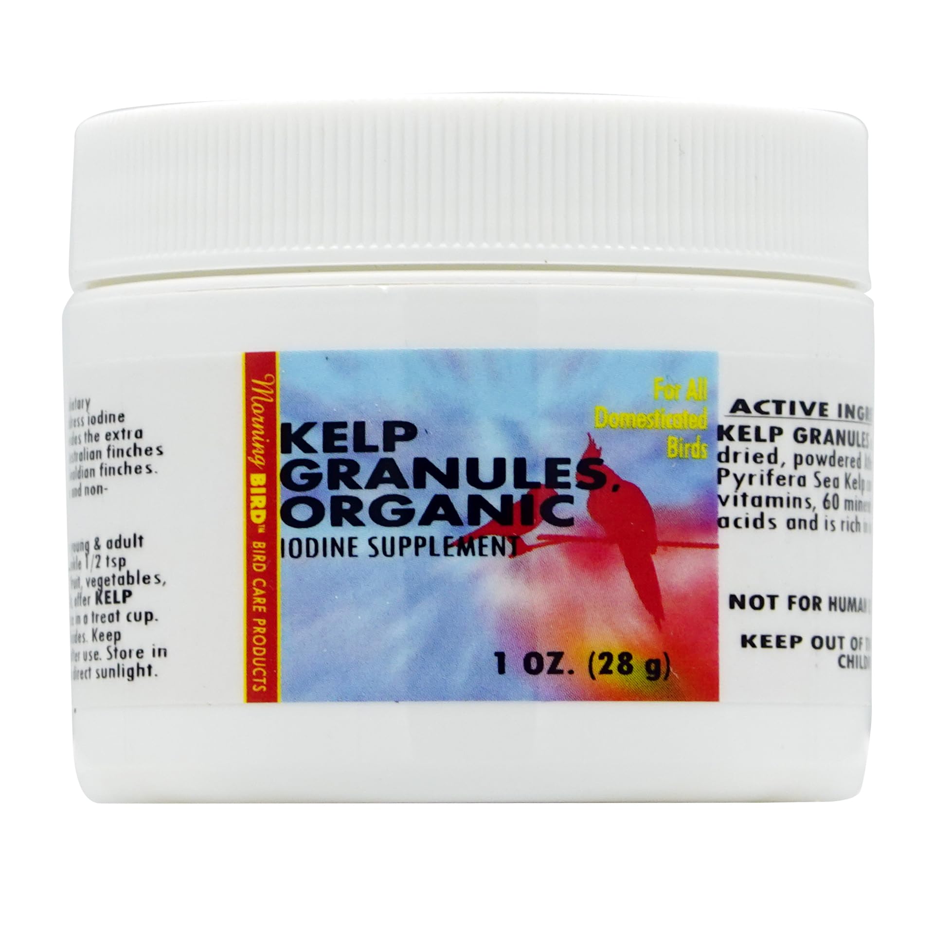 Kelp Granules KELP GRANULES is a dietary supplement designed to address iodine deficiencies in birds. Iodine is required for proper thyroid functioning. Iodine deficiencies can result in difficult moults, poor feather condition, breathing and singing problems, inactivity and poor breeding. Kelp Granules provides the extra dietary iodine needed by Australian finches and eliminates balding in Gouldian finches. DIRECTIONS FOR USE: Feed Kelp Granules to young and adult birds daily year round. Sprinkle teaspoon over one cup of fruits, vegetables, soaked seed or softfood OR offer as a free choice in a treat cup. One level teaspoon equals 5 ml. Keep container closed before and after use. Not for human consumption. Keep out of the reach of children. Store in a cool, dry place. ACTIVE INGREDIENTS: Pure, dried, powdered Atlantic Macrocystis Pyrifera Sea Kelp containing 12 vitamins, 60 minerals, 21 amino acids and rich in iodine. Non-swelling, non-toxic, non-polluting. This product is free of pesticides. WARNING Not For Human Consumption. Keep out of the reach of children. NOTE: These statements have not been evaluated by the Food and Drug Administration. This product is not intended to diagnose, treat, cure or prevent any disease. Packaging: 1 oz, 3oz & 1lb Now available in new tamper-evident bags.