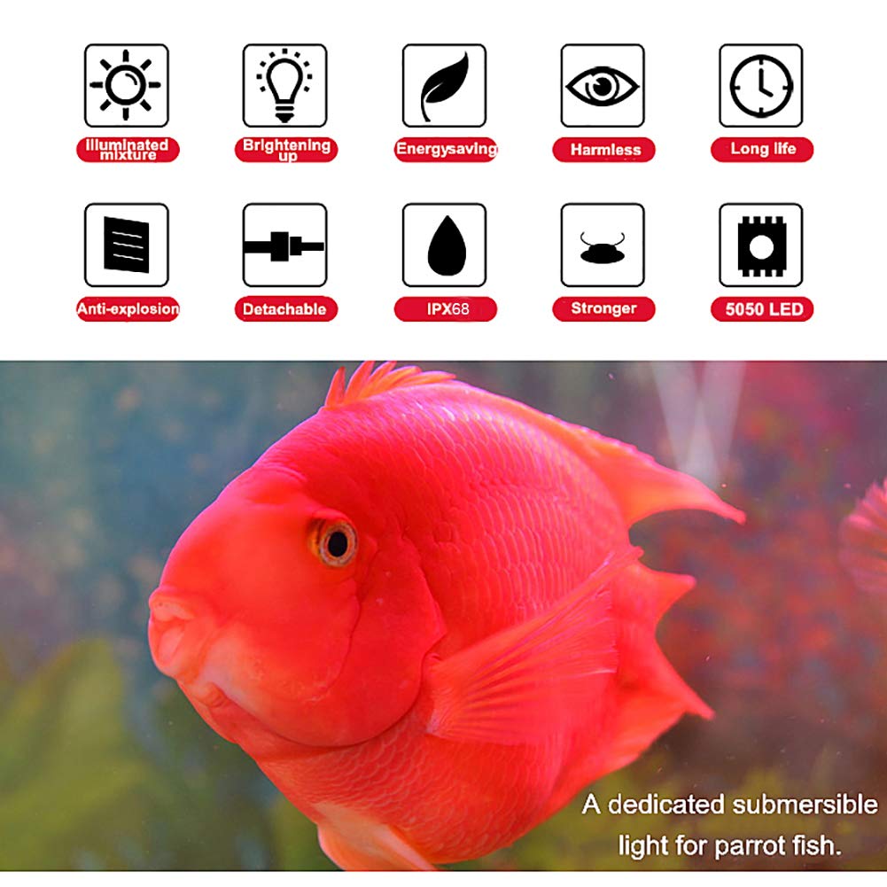 Specifications: Waterproof: IP68 Waterproof for the LED bar Numbers of LED Lights: 9 Light Color: 16 color with 4 modes LED Light Type: 5050 Light Bar Length: 8in(20cm) Fitting Aquariums: 10-15in Power Cable Length: 6.56ft(2m) Input: AC 100-240V / 47-63Hz Output: DC12V Material: ABS plastic and acrylic glass Power plug: US plug (note: the Power Adapter with switch is Non-submersible!)