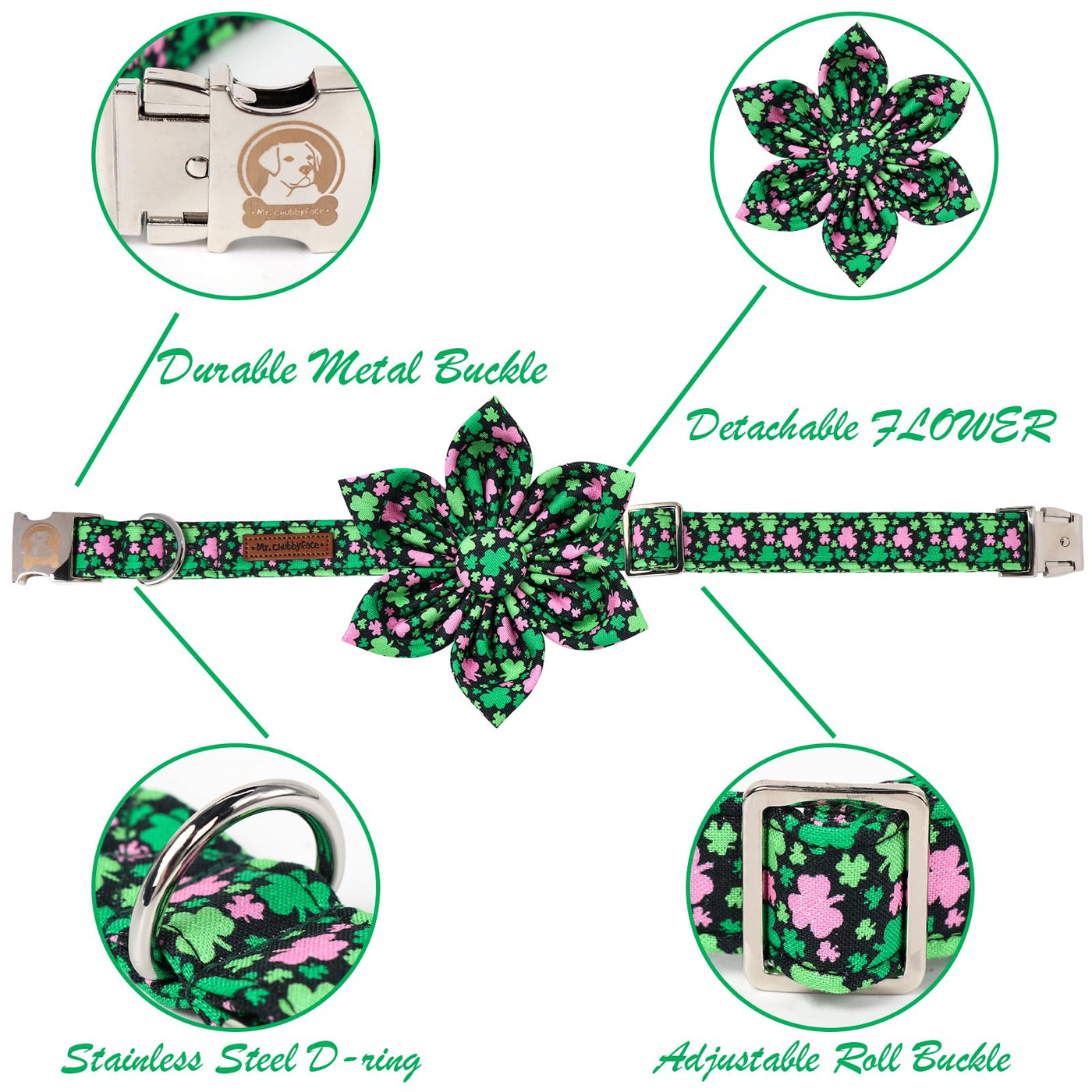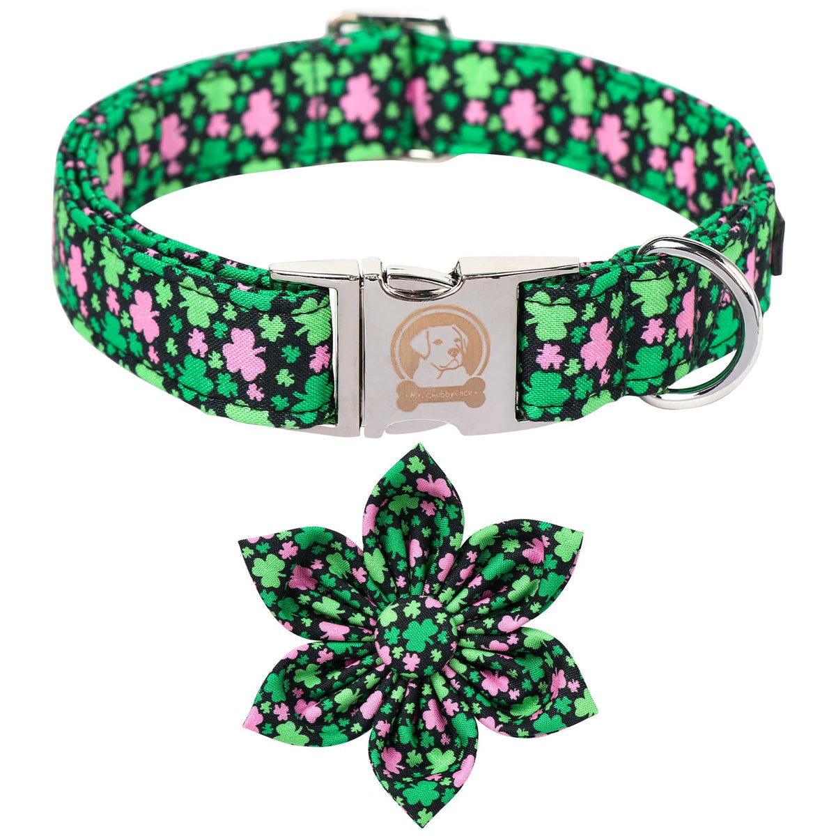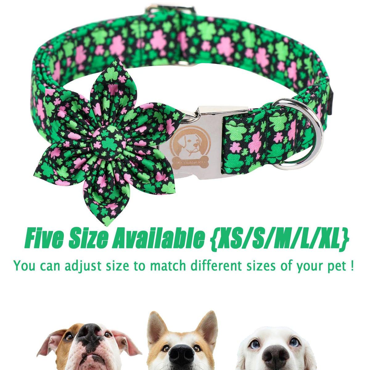Mr. Chubbyface St.Patrick'S Clover Dog Collar With Flower, Pink Green Clovers Shamrock Adjustable Dog Collar, Cute St.Patrick'S
