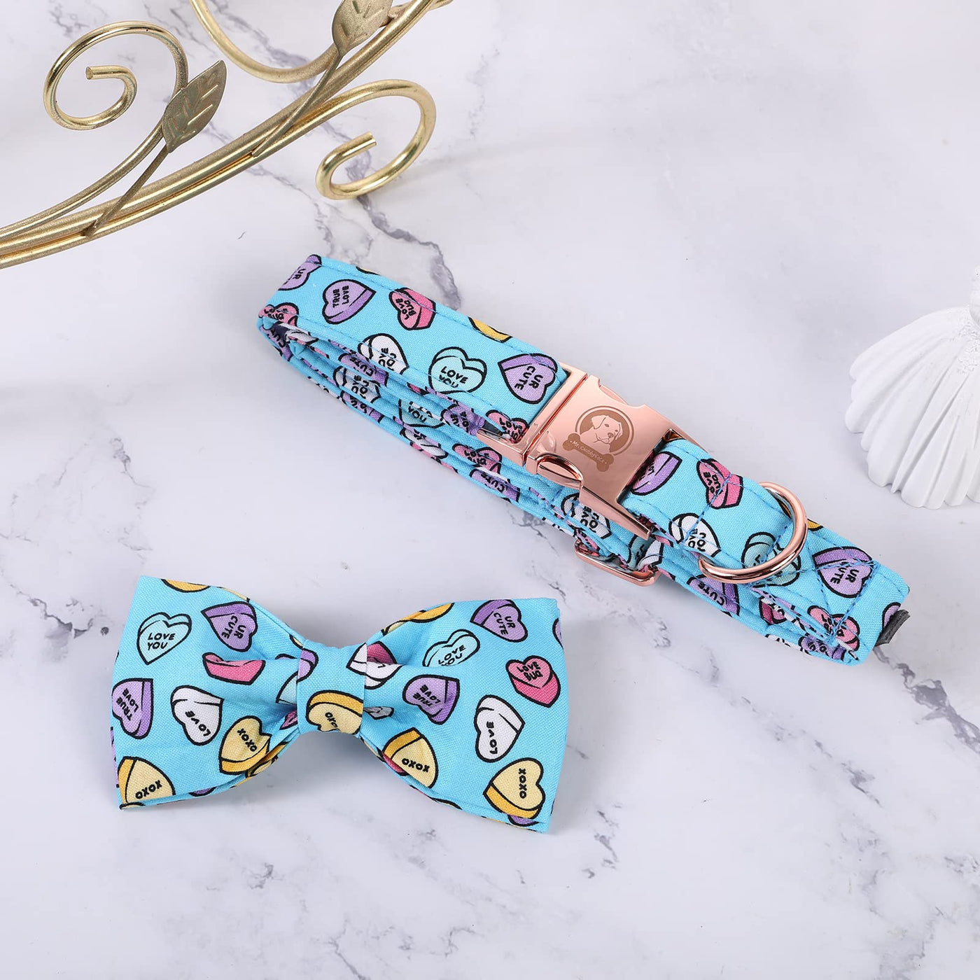 Mr. Chubbyface Valentine'S Dog Collar With Bowtie, Cute Blue Heart Dog Collar With Metal Buckle, Adjustable Cotton Collar For Sm