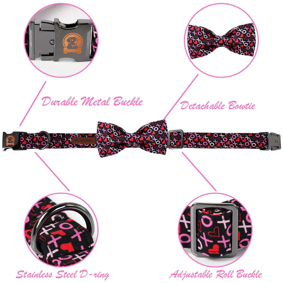 Mr. Chubbyface Valentine'S Dog Collar With Bowtie, Xoxo Red Heart Dog Collar With Metal Buckle, Cute Adjustable Boy Girl Female