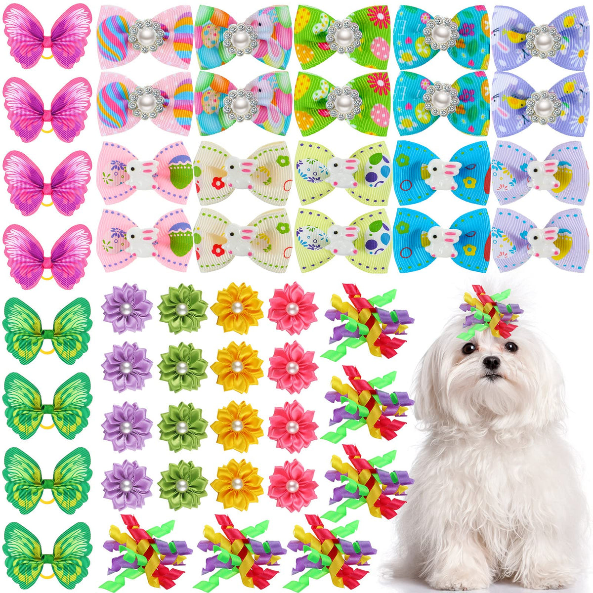 Mtlee 50 Pcs Easter Dog Bows Dog Hair Bows Grooming Bows Cute Rabbit Pattern With Rubber Bands Puppy Yorkie Cat Bunny Butterfly