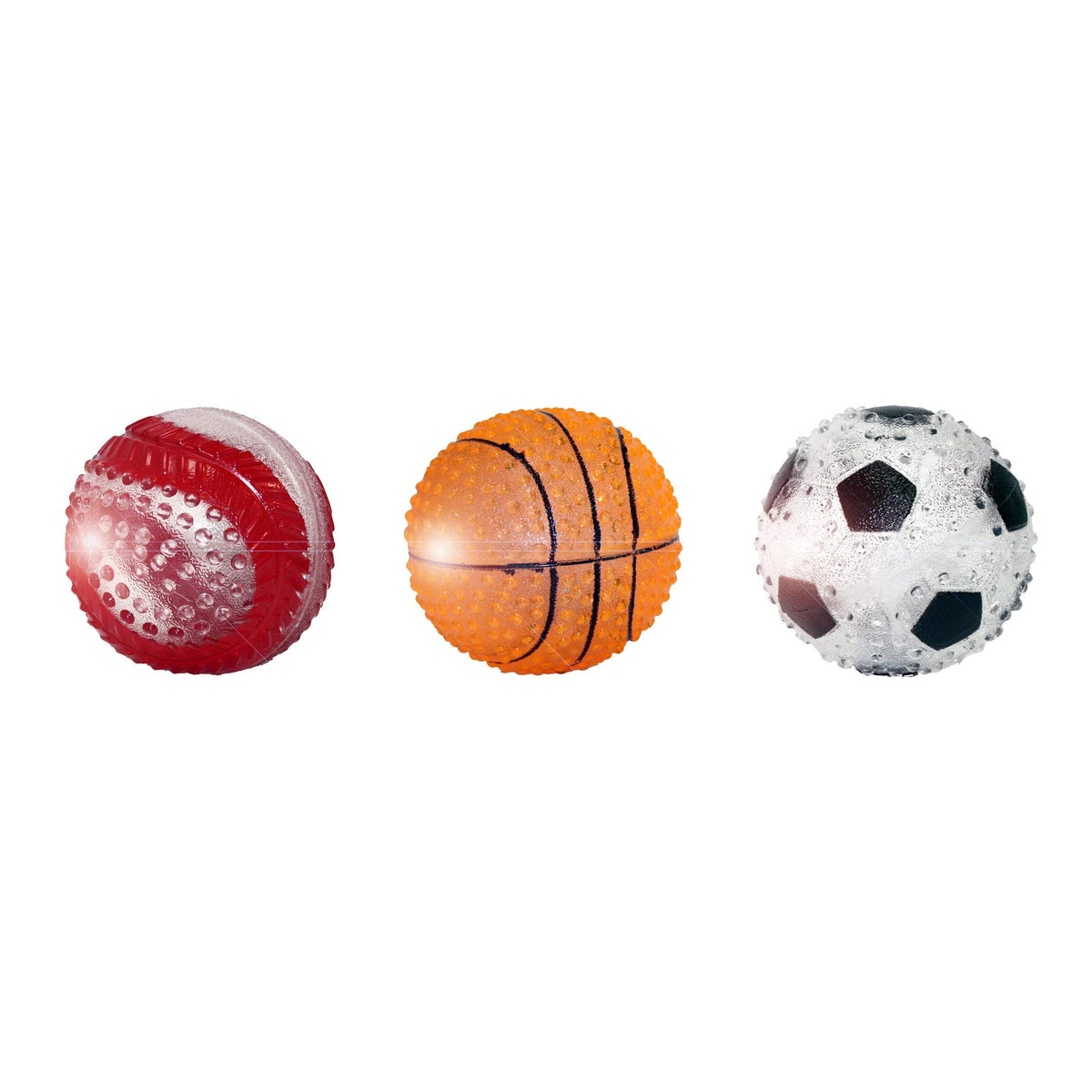 2.5'', Dog lucent TPR Light Up Sports Ball Dog Toy, Features A LED Light That Is Adhered To The Inside Of The Toy That Flashes On When The Toy Is Chewed Or Bounced, Great For Outdoor Play Even At Night, 3 Assorted Styles: Baseball, Basketball Or Soccer Ball.