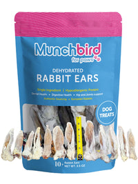 Munchbird Dehydrated Rabbit Ears for Dogs - A Nutritious Treat Looking for a healthy alternative to pig ears, cow ears, lamb ears, or rabbit feet? Look no further than Munchbird Rabbit Ears for Dogs, the perfect hypoallergenic dog treats. These premium, crunchy, air-dried rabbit ears with fur and a bit of skin at the base offer a tasty and nutritious chewing experience for dogs. Perfect for all breeds, Munchbird Rabbit Ears are slowly dehydrated to retain nutrients while offering a satisfying, crunchy texture. Whether youre looking to replace pig ears, cow ears, lamb ears, or rabbit feet, these rabbit ears for dogs are a nutritious, natural option that promotes dental and digestive health. Our product includes only the crunchy ear portion, featuring finer fur thats easier to digest and gentler on the tummy.