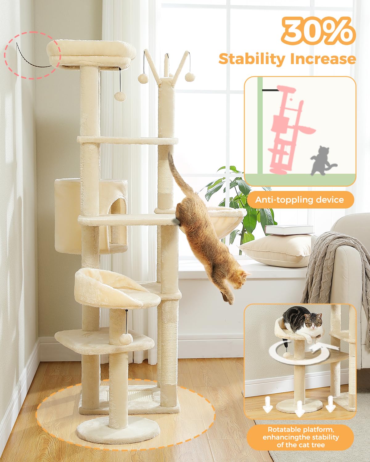 Muttros 59' Cat Tree, Tall Cat Tree For Large Cat, Multi-Level Cat Tower With 3 Removable Pompom Sticks, Cat Tree For Indoor Ca