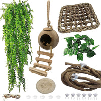 Our Products Include Fake Plants For Crested Gecko Tanks With Coconut Hide,Flexible Vine And Decorated Leaves,Can Simulate The Living Environment In The Wild, To Create A Familiar Gecko Lizard Tank Accessories Atmosphere For Your Crawling Pet,Can Make Your Pet Adapt Faster. Leopard Gecko Tank Accessories Climbing With Primitive,Rustic Beauty And Durable,Leopard Gecko Accessories Gecko Coconut Den Not Only Be Pet Hideouts Hanging Home,Also Be A Decoration. Specifications: Color: As Shown Materials:Natural Coconut Shells Size: Hanging Lizard Hide16.14 X 5.11 Inches/41.0 X 13.0 Cm Package Includes:1 X Leopard Gecko Hanging Hide 16.14 X 5.11 Inches/41.0 X 13.0 Cm 1X Coconut Silk Mat 1 X Reptile Hammock 7.1 X 7.1 Inches/18.0 X 18.0 Cm 1 X Reptile Vine Decoration 33.46 Inches/85.0 Cm 1X Flexible Bend-A-Branch Jungle Vines