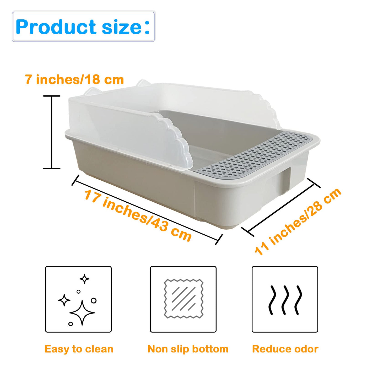 Protrusions On The Base Of Medium Litter Box Plastic To Increase Friction Of Cat Litter Boxes High Sides And The Floor,Cat Litterbox High Sides Not Easy To Move When Cat Is In And Out Of Litter Box For Cats Small Indoor;Low Entry Of High Side Cat Litterbox Is Designed On The Long Side,Adapt To Cat'S Habit Of Toilet;3 Colors High Sided Cat Litter Pan Are Available For You To Choose.Small Cat Litter Pan High Sides Has An Open Design,Which Can Promote Air Circulation And Reduce The Risk Of Bacterial Production In The Kitten Litter Pan Small With Sifter And Create A Fresh And Healthy Toilet Environment For Cat. Sifting Litter Box Small Is Easier To Clean And Watch.Small Litter Box And Scoop Is 8.3H,Entrance Height Of Large Senior Cat Litter Box Low Entry High Sides 4.3''.Litter Box With Steps Is Convenient For Old Cat And Kitten To Access To Litter Box With Lid.Cat Boxes For Indoor Cats Reduces Urine And Cat Litter Splashing.Small Enclosed Cat Litter Box Is Made Of Durability And Safe Pp Material.Edges Of Low Entry High Wall Litter Box For Senior Cats Are Smoothed To Make It Harder To Hurt Your Cat.You Can Use This Plastic Litter Box With Confidence For Your Cat. Specifications Of High Side Litter Boxes For Cats: Anti Mess Cat Litter Box In Color:As Shown Materials:Pp Meterial Size:Tall Skinny Cat Litter Box 17 11 7 Inches/43 X 28 X18Cm. Package Includes: 1 X Open Cat Litter Box Low Entry