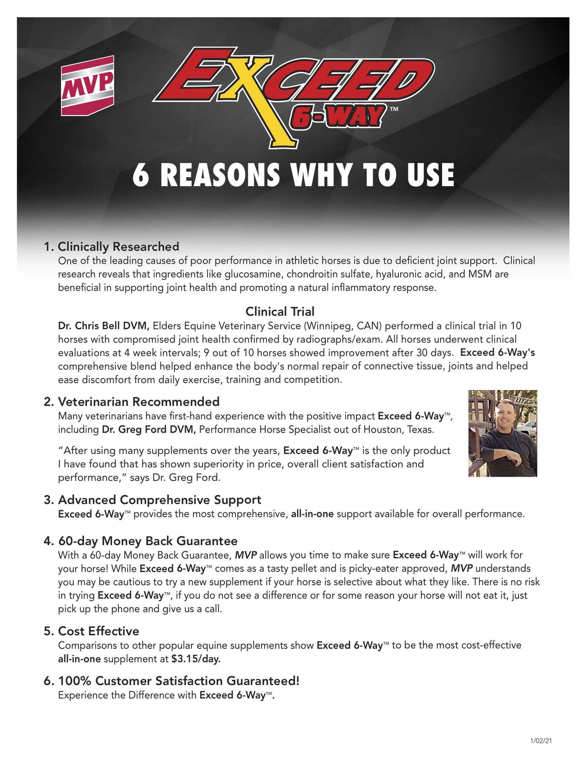 Exceed 6-Way offers the most comprehensive product available to high performance horses. Exceed 6-Way is a New Generation product that provides high levels of key ingredients for multi-level support in the following areas: Joint, Gut Integrity, Oxygen, Muscle, Blood, Hoof, Hair Coat and Digestion. All-in-One at an economical price. Directions for Use: Adult Horses (900 - 1,100 lbs.): Provide 1 scoop (2 oz.) twice daily for a total of 4 ounces per day.