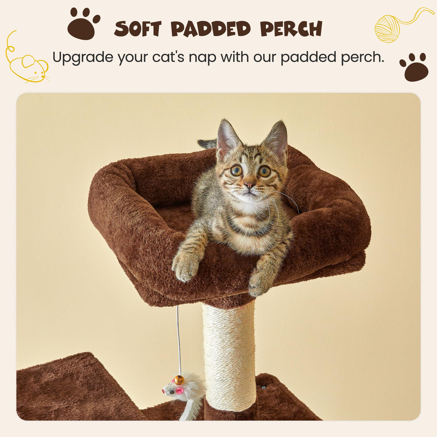 Q: What materials are used in the construction of the cat tree?A: This cat tree is made from durable wood and features sisal-covered scratching posts, ensuring both stability and a safe environment for your pets.