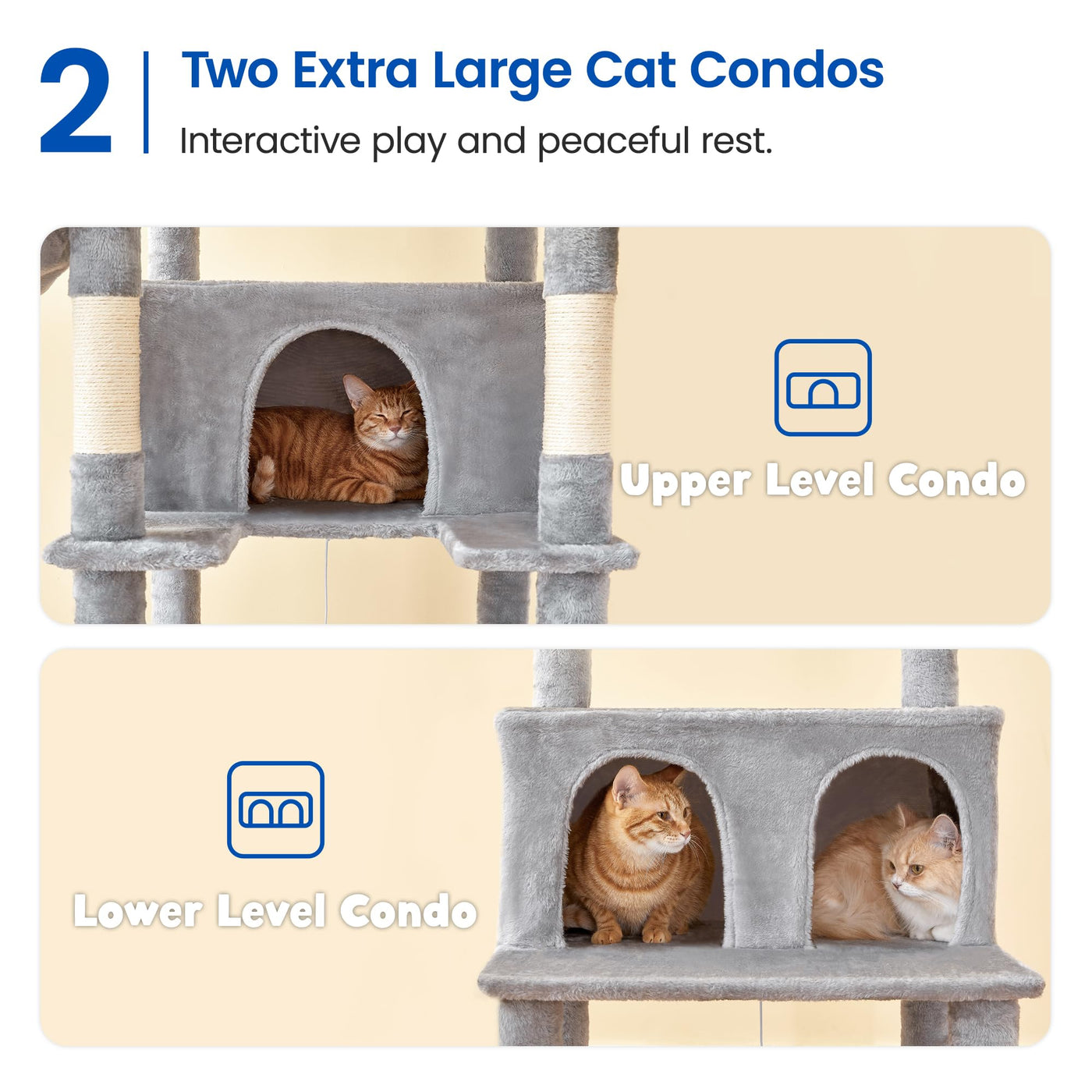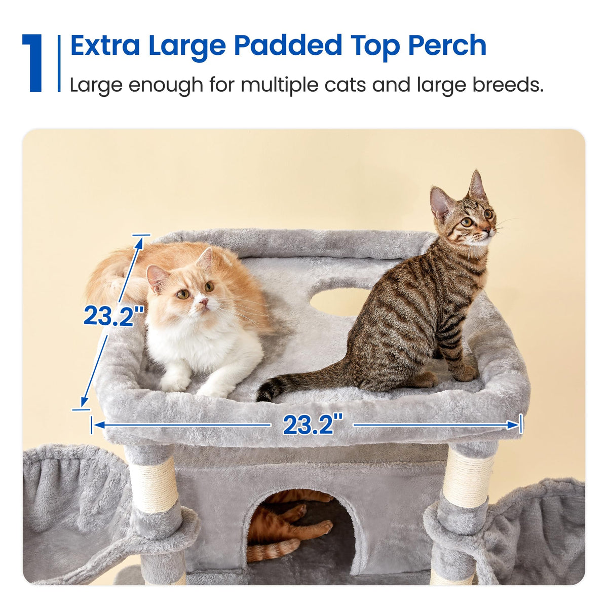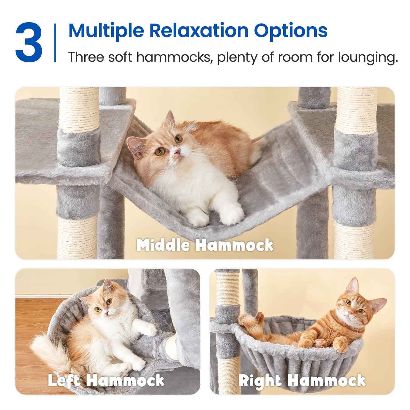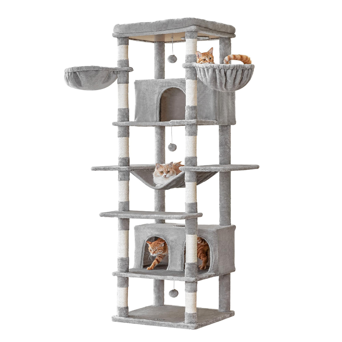 Q: How many cats can comfortably use this cat tree?A: This cat tree is ideal for multiple cats due to its spacious design, including two large condos, three hammocks, and sturdy platforms that provide plenty of room for play and relaxation.