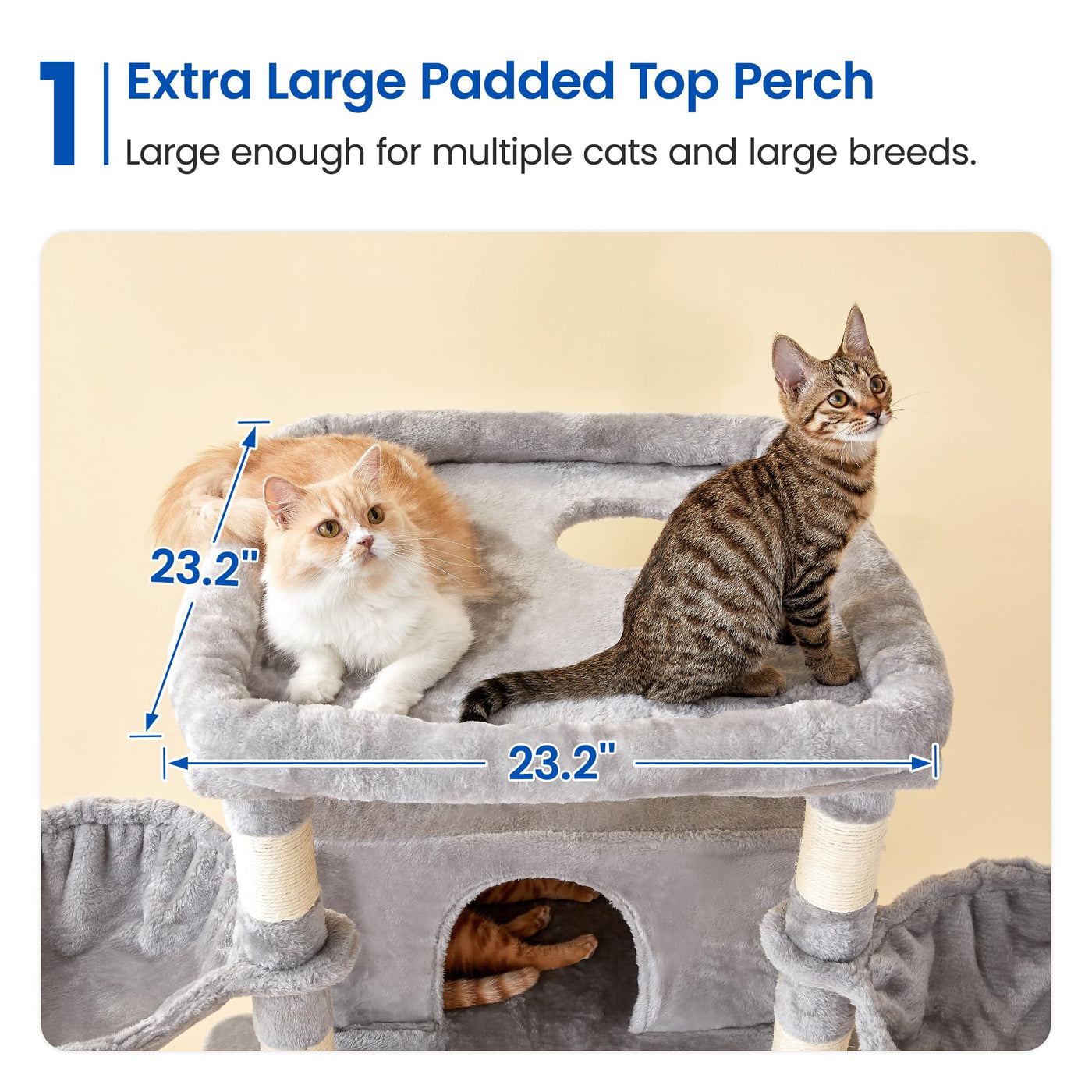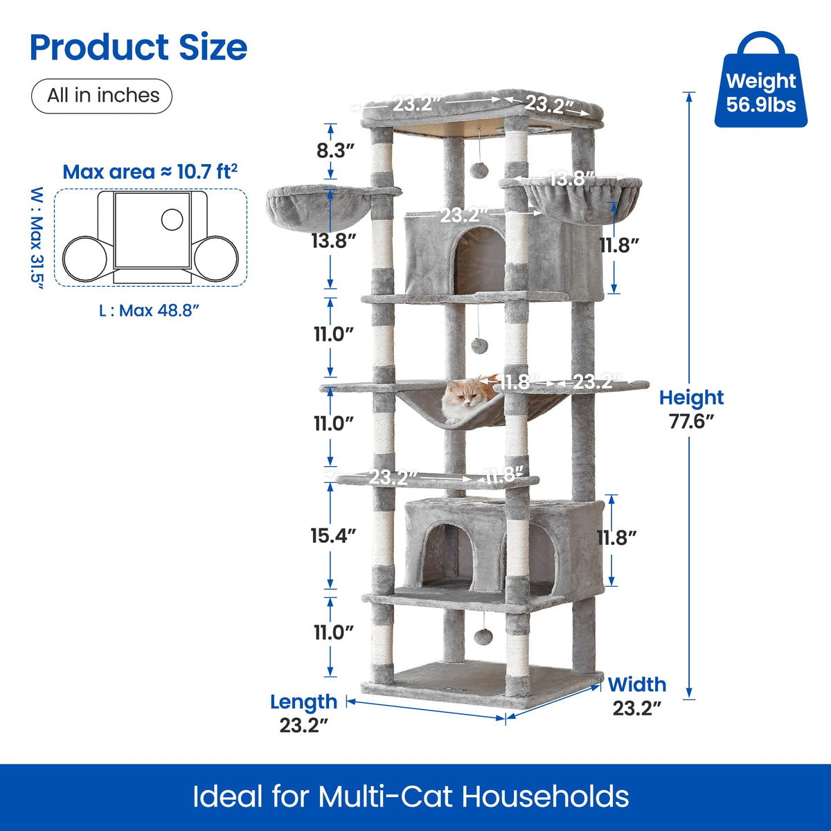 Endless climbing Fun] - MWPO extra large cat tree standing at 776 inches tall offers plenty of space for even larger and more active indoor cats Featuring multiple levels and sturdy platforms its great for multi-cat households Extra Large cat condos] - Our cat tower with two extra-large cat houses one on the lower level and one on the upper level Your furry friend can snuggle up and nap in comfort whether they prefer to be up high or down low comfy and Entertainment] - Equipped with 3 cozy hammocks a large padded perch 12 scratching posts and 3 dangling toys this cat tree combines comfort and fun perfectly providing your cat with endless entertainment and playtime Reliable Stability] - Our cat tree is designed with stability in mind The thick and wide baseboard provides a solid foundation Plus it comes with an anti-toppling strap for added safety so your cats are secure while they climb and play customer-Focused Service] - At MWPO we prioritize our customers satisfaction above all else Our friendly customer service team is available to assist you with any questions or concerns you may have before and after your purchase