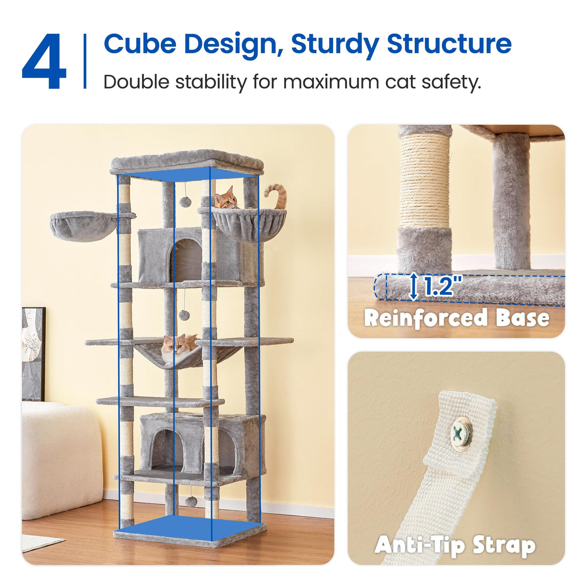 Q: Is the cat tree safe for my pets during use?A: Yes, the MWPO Extra Large Cat Tree features a thick and wide baseboard for stability, along with an anti-toppling strap that ensures your cats are secure while climbing and playing.