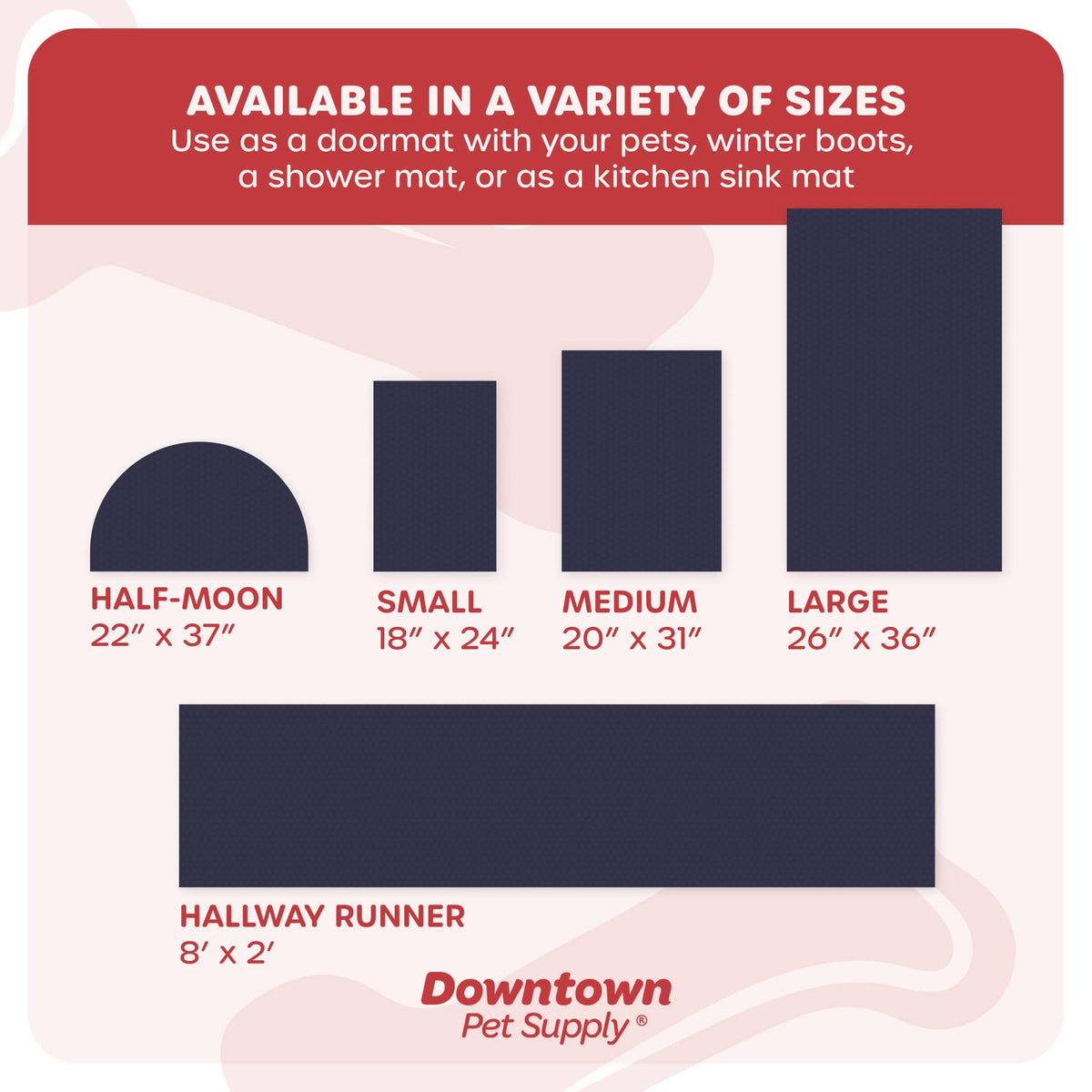 Q: What sizes and colors are available for the My Doggy Place door mat?A: The My Doggy Place door mat comes in various sizes, including medium (31 in x 20 in), large (36 in x 26 in), x-large (60 in x 36 in), and hallway runner (8 ft x 2 ft). It is also available in multiple colors such as navy blue, red, oatmeal, brown, and more.