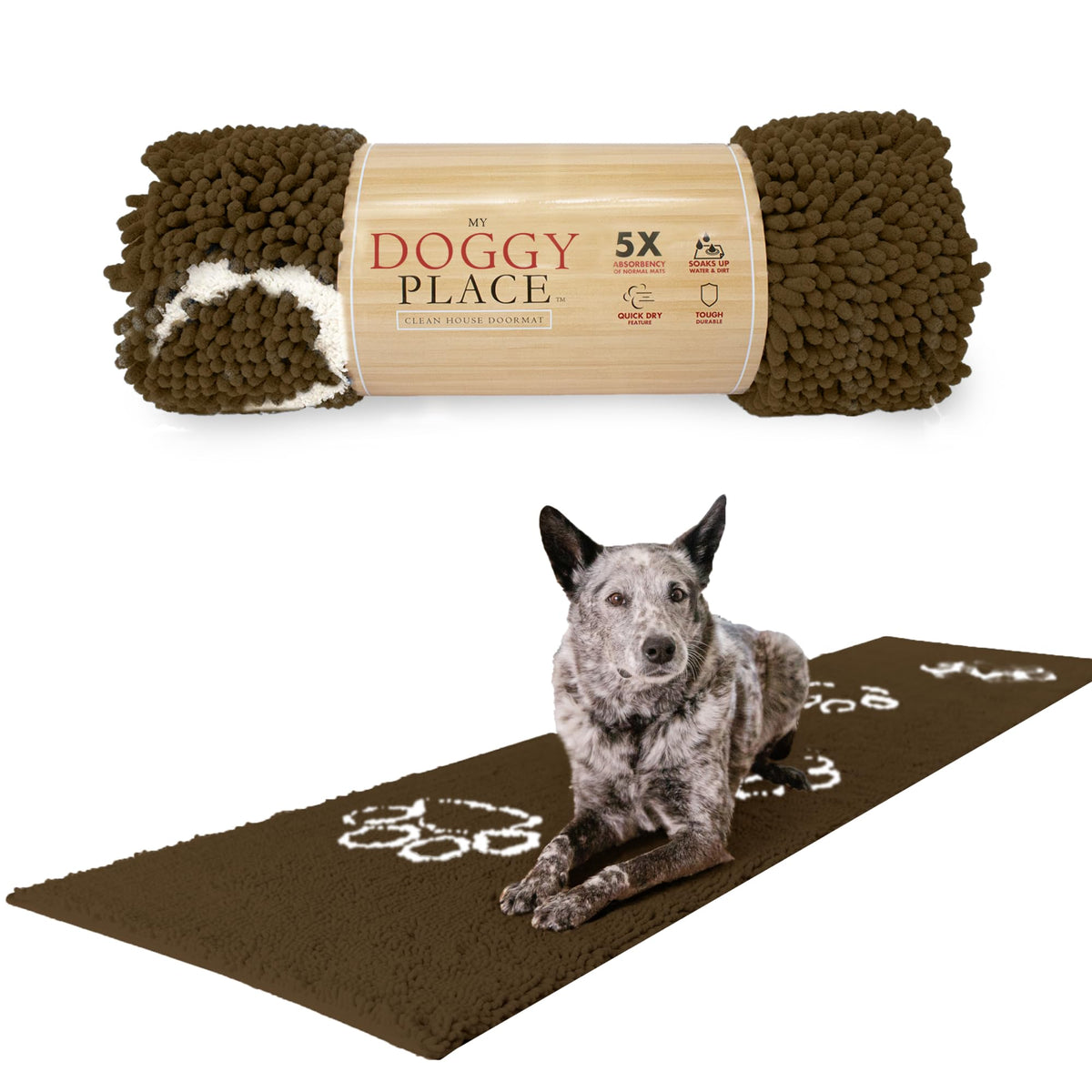 My Doggy Place ultra-absorbent dog mat is your solution to clean and inviting entryways. This non-slip dog mat enhances your homes aesthetic appeal and tackles the toughest messes with ease. Its long microfiber strands effortlessly trap water, mud, and dirt, preventing them from being tracked inside. The double stitching in this absorbent mat ensures its ability to withstand heavy foot traffic and everyday use, ensuring long-lasting durability. Our pet mat incorporates a non-slip rubber backing for stability and peace of mind so you can confidently step on and off the mat without worrying about slips or falls. Unlike ordinary dog mats, our chenille microfiber dog mat is five times more absorbent, allowing it to soak moisture and dry quickly. Say goodbye to soggy, damp mats and hello to a clean and dry entryway. With its washer and dryer-safe design, this dog mud mat is easy to clean, ensuring a consistently fresh and inviting atmosphere in your home. This versatile mat is also suitable for both indoor and outdoor use, adapting to any space in your home. At the same time, its soft and plush texture adds a touch of elegance and comfort, making it a welcoming sight for you and your guests.