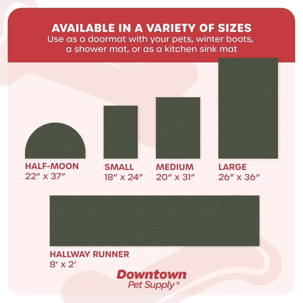Q: What sizes and colors are available for the My Doggy Place mat?A: The My Doggy Place mat comes in various sizes including medium (31 in x 20 in), large (36 in x 26 in), x-large (60 in x 36 in), and hallway runner (8ft x 2ft). It is also available in multiple colors such as red, oatmeal, brown, charcoal, navy blue, deep teal, light grey, sage green, ash, pink, mint green, and violet.