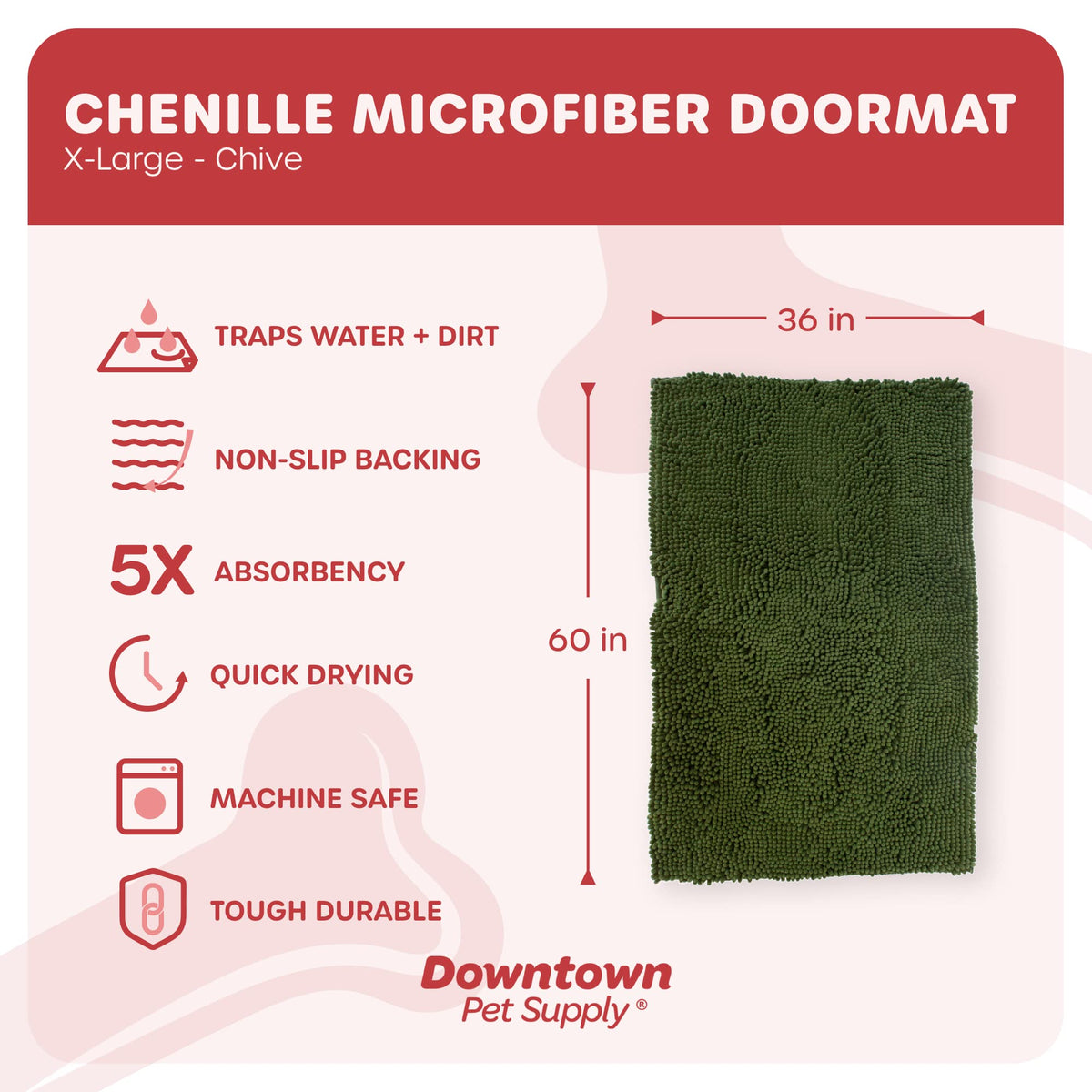 Prevent mud and dirt from getting in your house! Clean house, clean pets, happy life! The My Doggy Place clean house doormat is an ultra-absorbent microfiber chenille pet door mat. It has 5x the GSM absorption rate of normal mats and soaks up dirt and water like magic. Made with tough durable stitching construction and materials with 'no slip' backing feature, it is safe, quick drying and Machine Washable. This doormat comes in a variety of sizes and styles (medium 31 in x 20 in, large 36 in x 26 in or x-large 60 in x 36 in and hallway runner 8ft x 2ft) and colors (red, oatmeal, brown, charcoal, navy blue, deep teal, light grey, sage green, ash, pink, mint green, violet) so it will fit perfectly in your kitchen, bathroom, bedroom or any other room of your choice. At My Doggy Place, we've been making our own products for years. Why does that matter? We stand behind our products! We are proud pet owners first and business owners second. We understand that a pet is a family member and that means they should be cared for, trained and pampered with the best pet supplies out there. Excellent quality at an affordable price with the best possible service. That’s why our products typically cost a bit less than the other guys. Think of us as your personal shoppers. If you bring it home and it isn't perfect, we'll send you a new one immediately, no questions asked! We stand behind our returns policy.