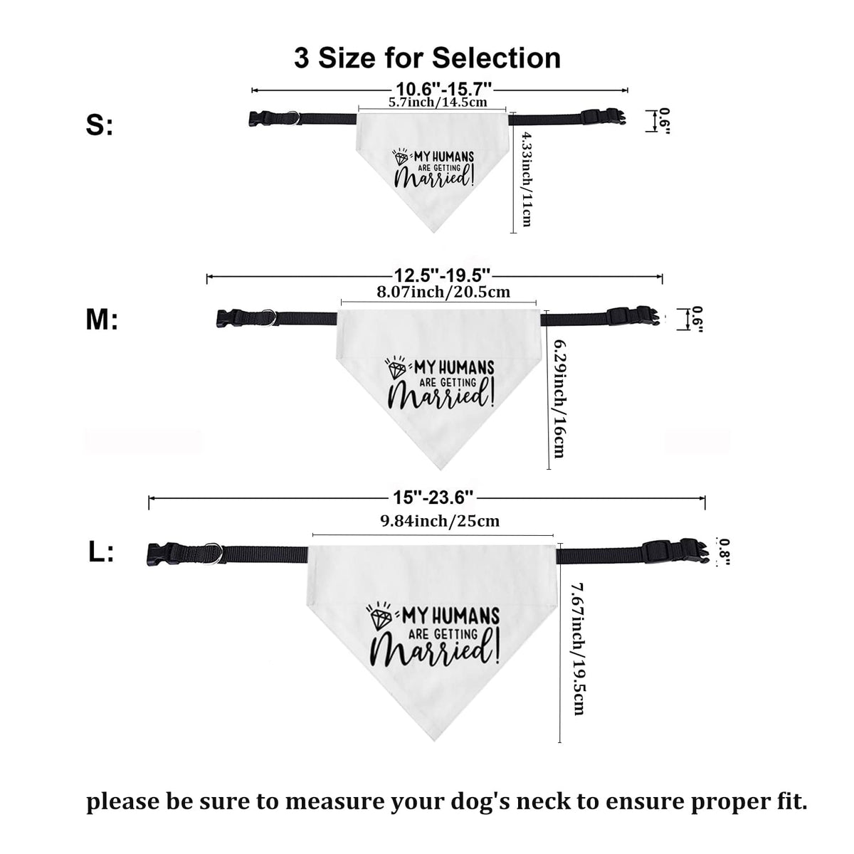 Q: What sizes are available for the My Humans are Getting Married Dog Bandana?A: The My Humans are Getting Married Dog Bandana is available in three adjustable sizes: Small (S) with an adjustable length of 27-40 cm, Medium (M) with an adjustable length of 32-50 cm, and Large (L) with an adjustable length of 38-60 cm. It's essential to measure your dog's neck to ensure a proper fit.