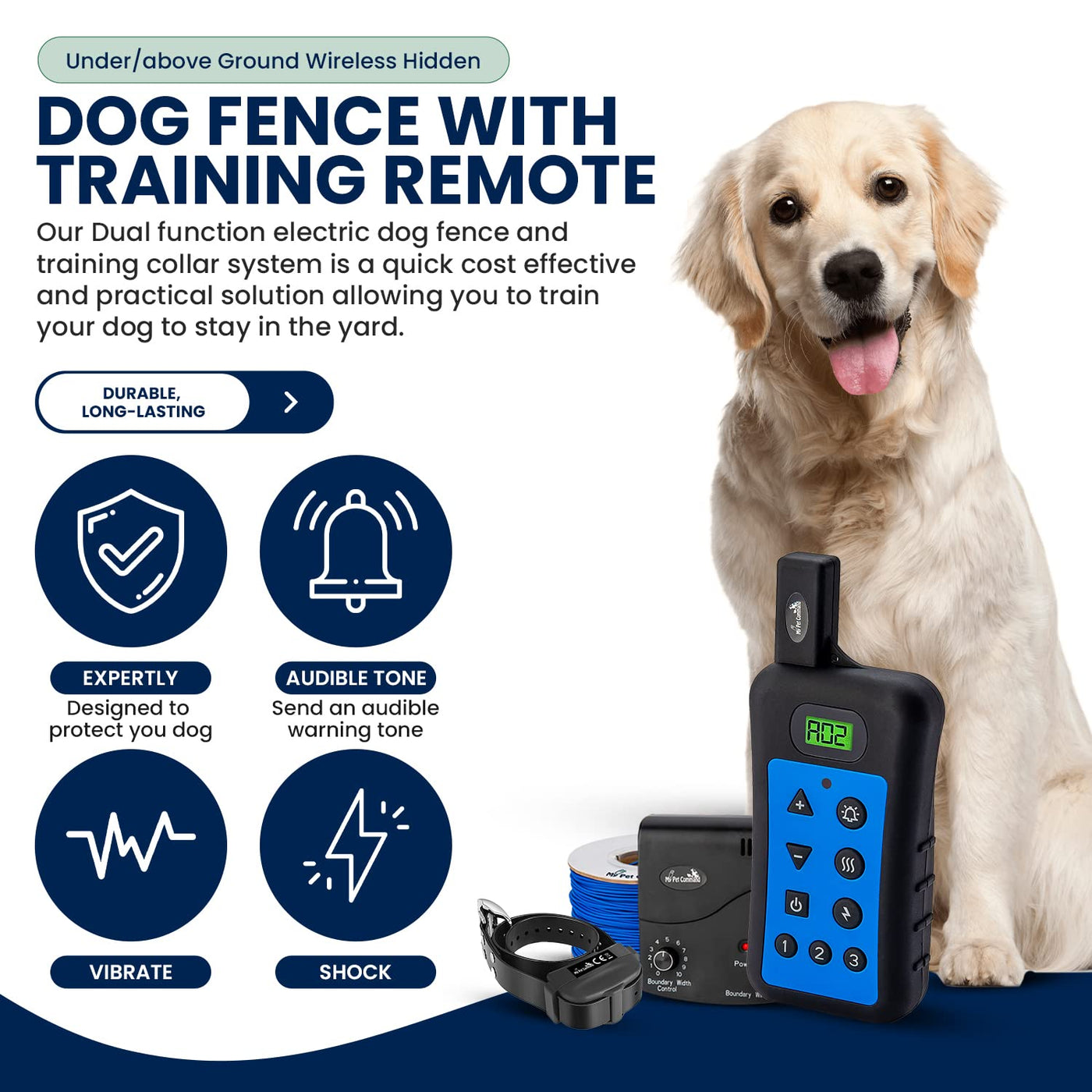 My Pet Command wireless dog containment/training kit comes with following features:- High Quality Robust waterproof IPX7 collars (Submergible to 3.3 ft) and remote control trainer. Fully Rechargeable long Battery life Extra thick 13 AWG outer core high quality outdoor robust Polyolefin solid copper core cable use in or above ground expandable for up to 10 acres of Coverage Dual Function Use the remote for Manual training can pair 3 collars to 1 remote and wire outdoor fence for Automatic pet Containment unlimited collars ¾ Mile (1200m) remote training range